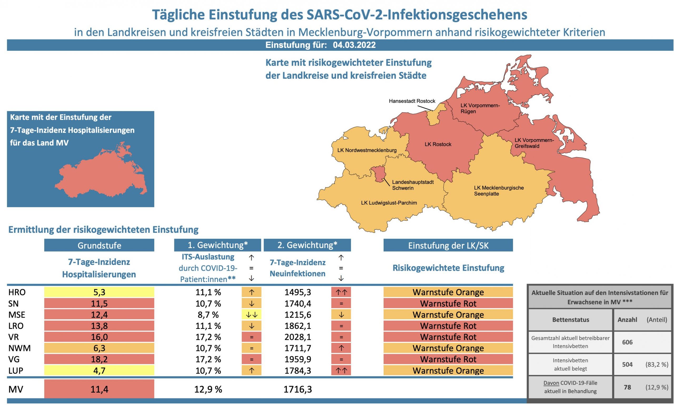 Die Hospitalisierung in ganz Mecklenburg-Vorpommern liegt heute bei 11,4, die Inzidenz des Landes steigt von 1678,1 auf 1716,3. Das Land Mecklenburg-Vorpommern meldet heute 4349 Neuinfektionen und zehn neue Todesfälle.