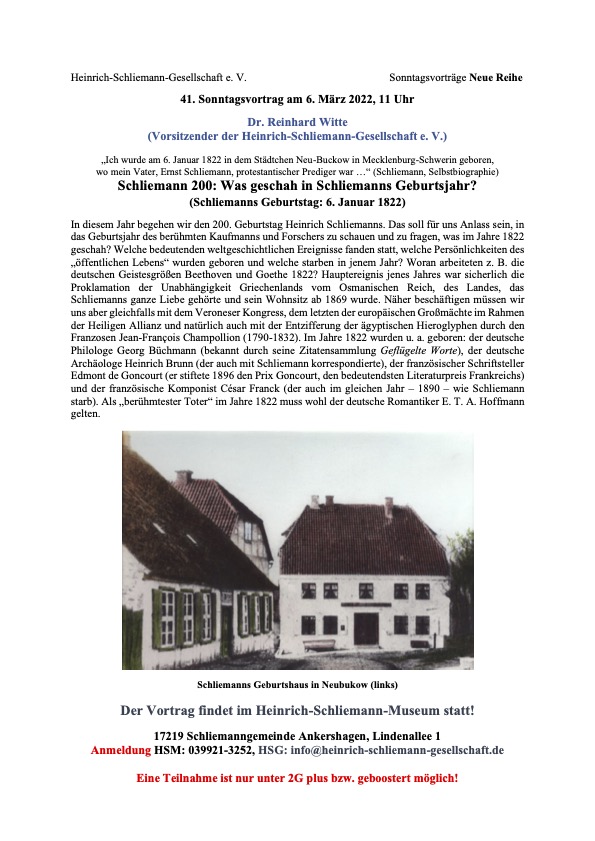 Die Vortragsreihe der Schliemann-Gesellschaft wird sich im Jubiläumsjahr – es wird Schliemanns 200. Geburtstag begangen – hauptsächlich mit dem Leben und Werk Heinrich Schliemanns beschäftigen. Den Auftakt am morgigen Sonntag, 6. März, macht ab 11 Uhr der Vortrag von Dr. Reinhard Witte, der das Geburtsjahr Schliemanns mit einem Blick auf weltgeschichtliche Ereignisse betrachtet.