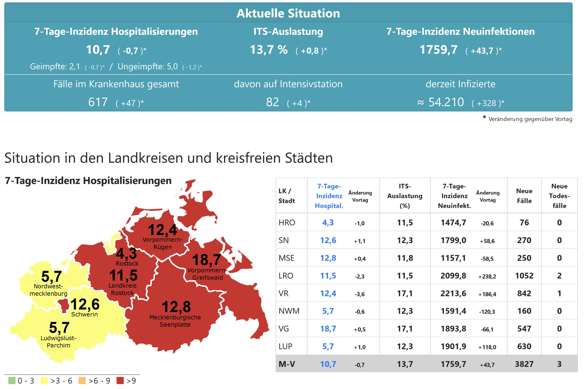 Die Hospitalisierung in ganz Mecklenburg-Vorpommern liegt heute bei 10,7, die Inzidenz des Landes steigt von 1716,3 auf 1759,7. Das Land Mecklenburg-Vorpommern meldet heute 3827 Neuinfektionen und drei neue Todesfälle.