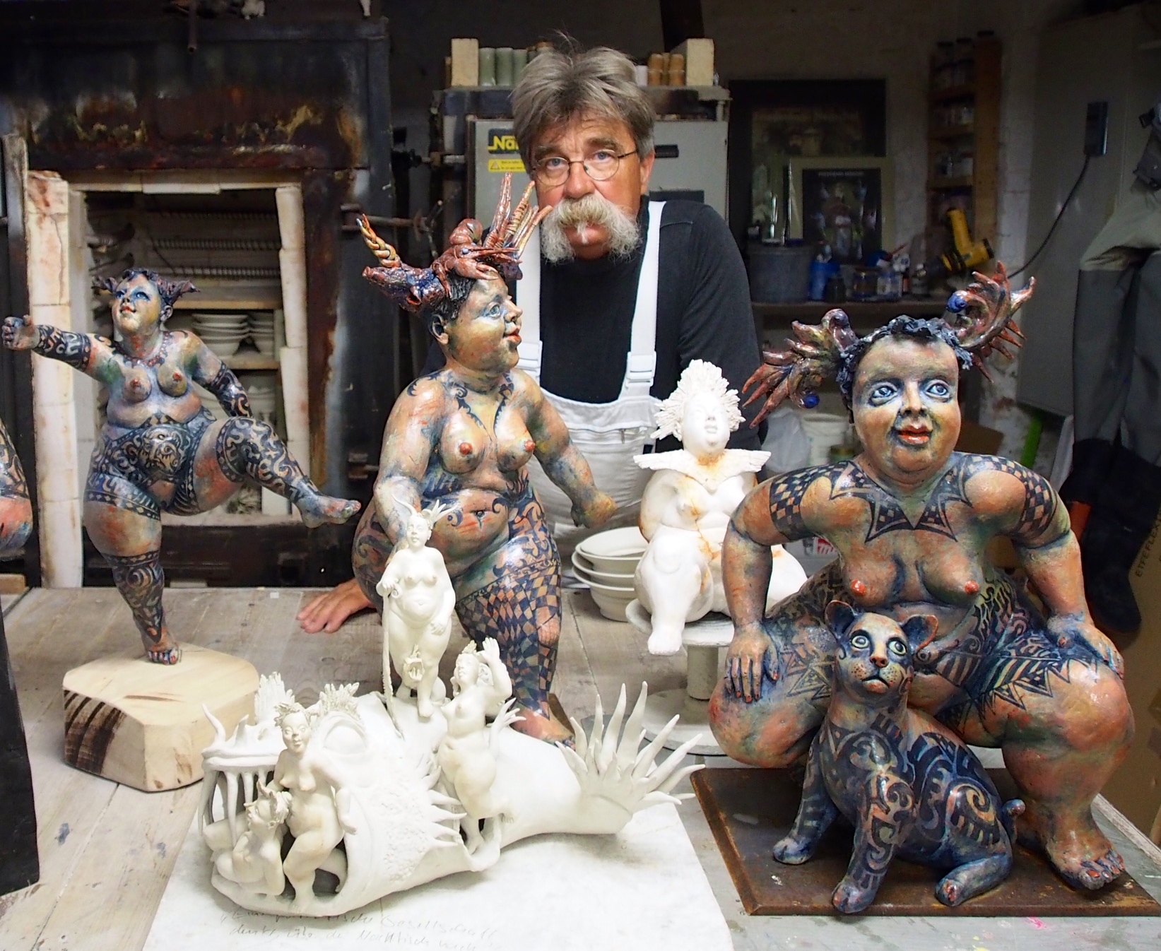 Die frivolen Frauenfiguren von Friedemann Henschel inspirieren im Gutspark und der Keramikwerkstatt zum Flirten. Mit vitalem Humor lädt der gestandene Keramiker ein, ausladende Wesen von kühnen Proportionen und erzählfreudigen Details zu betrachten, lässt füllige Frauen auf Tüllen reiten und bemalt Vasen und Becher mit phantastischen Szenerien.