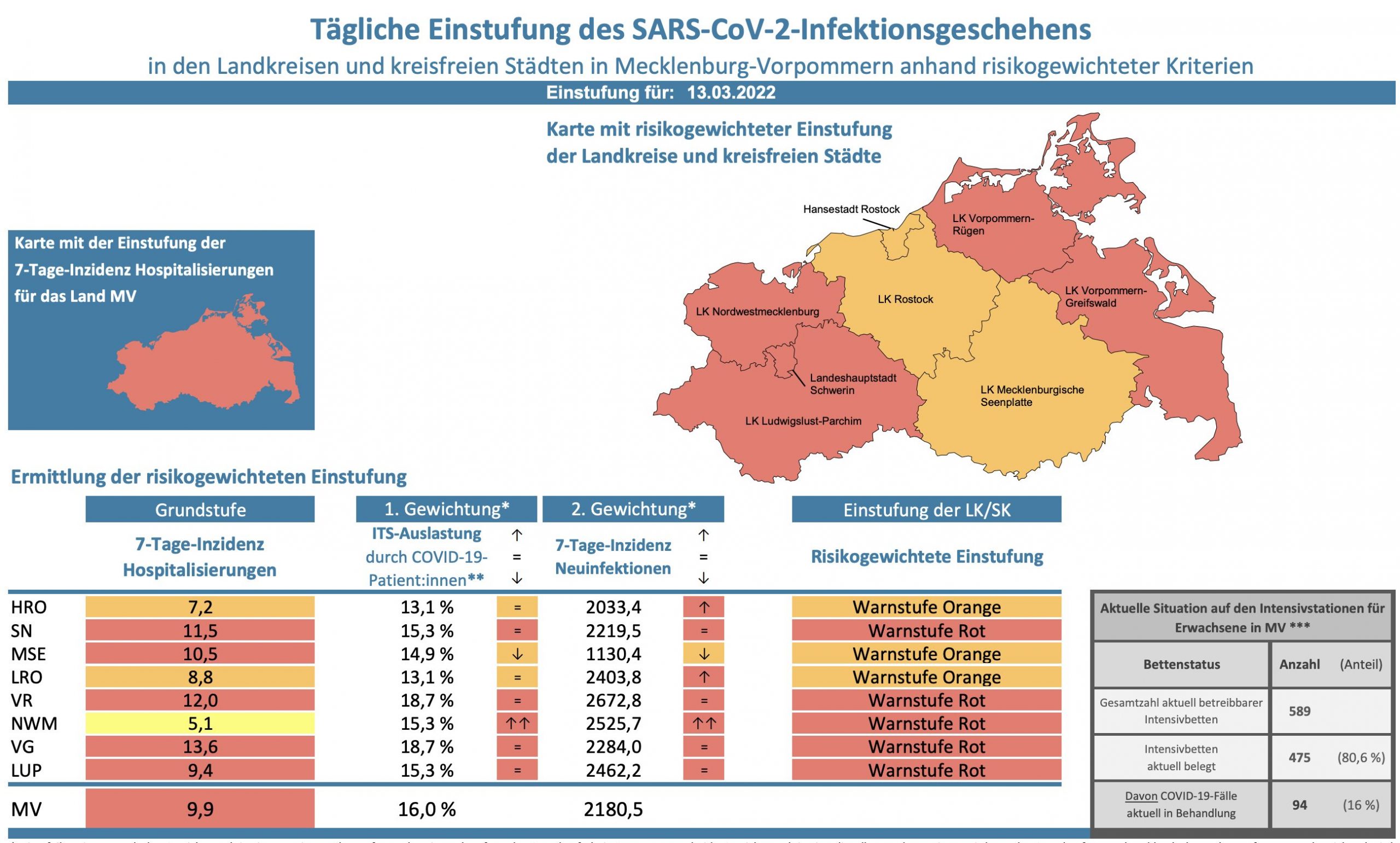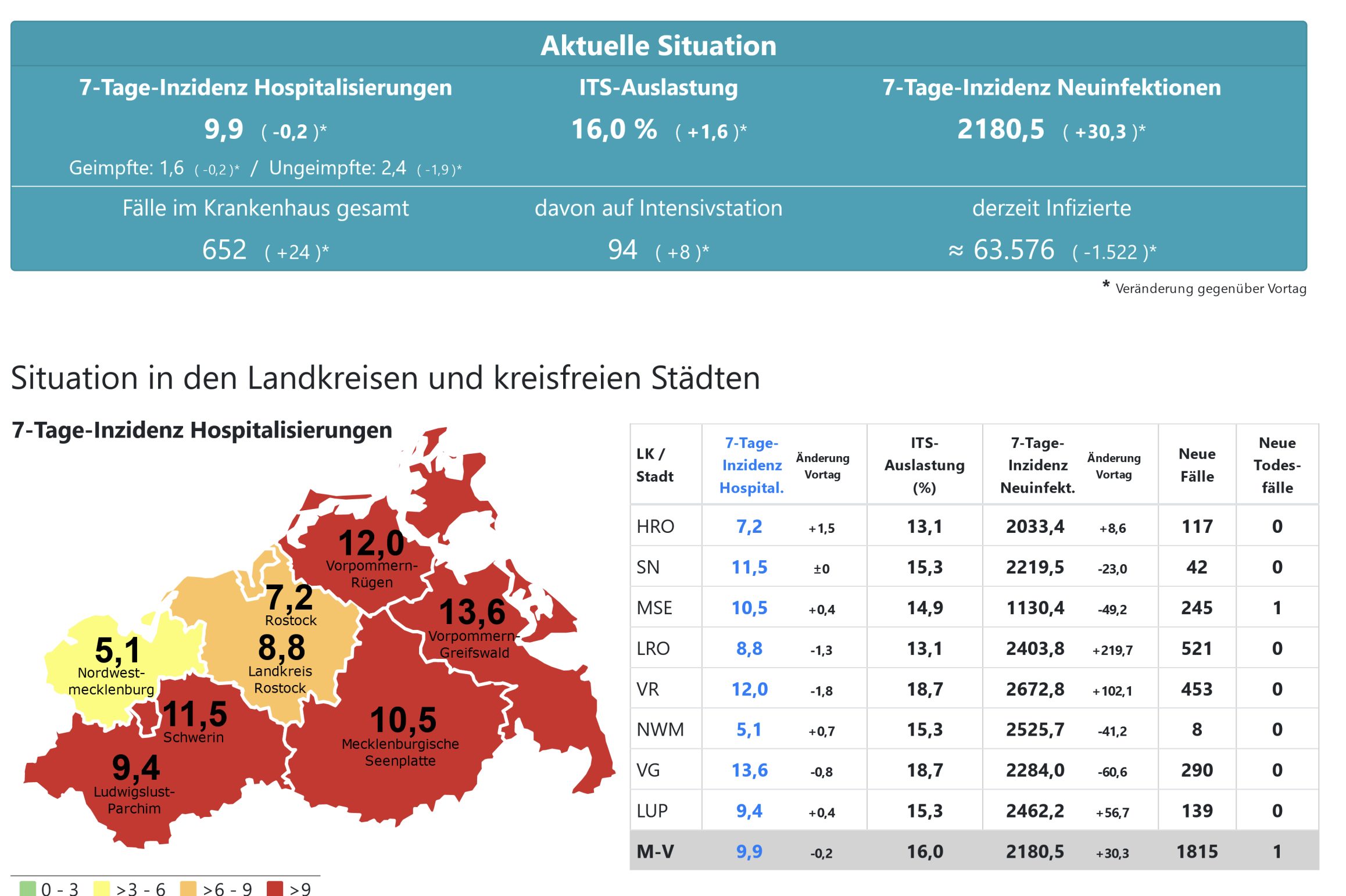 Die Hospitalisierung in ganz Mecklenburg-Vorpommern liegt heute bei 9,9, die Inzidenz des Landes steigt von 2150,5 auf 2180,5. Das Land Mecklenburg-Vorpommern meldet heute 1815 Neuinfektionen und einen neuen Todesfall.