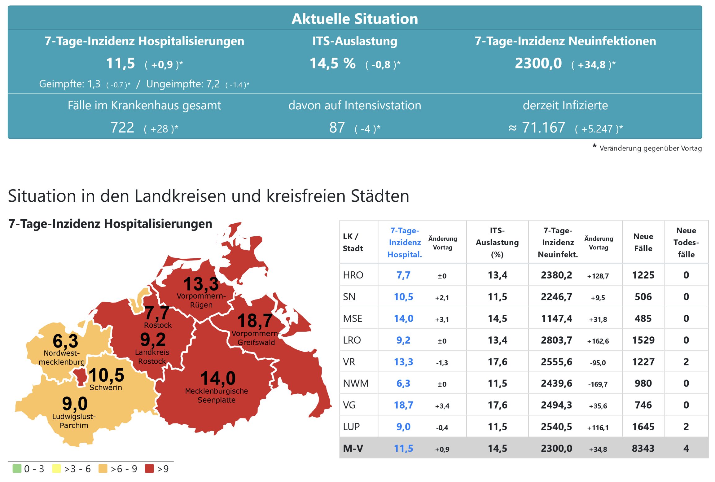 Die Hospitalisierung in ganz Mecklenburg-Vorpommern liegt heute bei 11,5, die Inzidenz des Landes steigt von 2266,9 auf 2300,0. Das Land Mecklenburg-Vorpommern meldet heute 8343 Neuinfektionen und vier neue Todesfälle.
