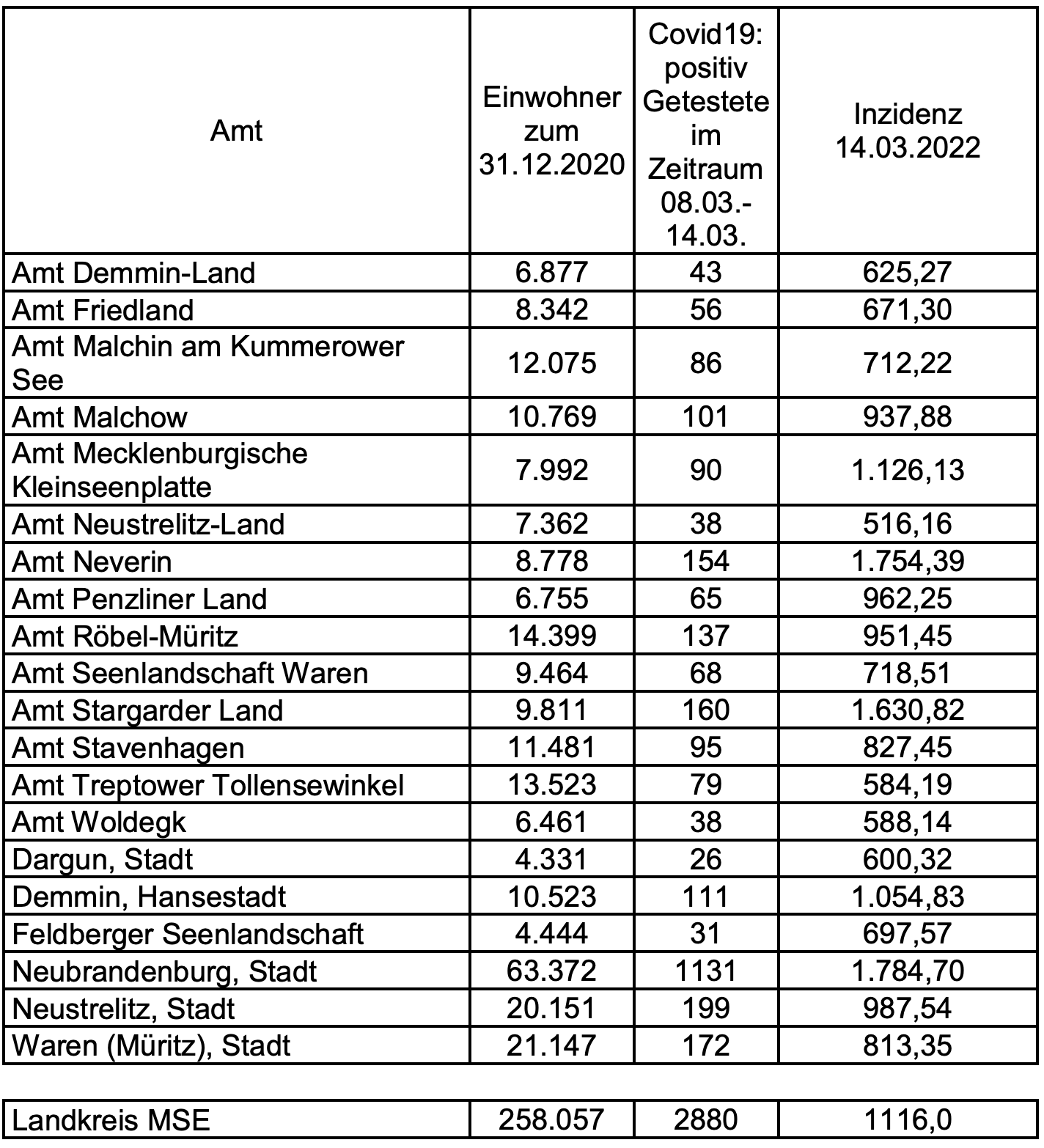 In diesem Artikel finden Sie heute wieder die Inzidenzen des Landkreises Mecklenburgische Seenplatte – aufgelistet nach Städten und Ämtern.