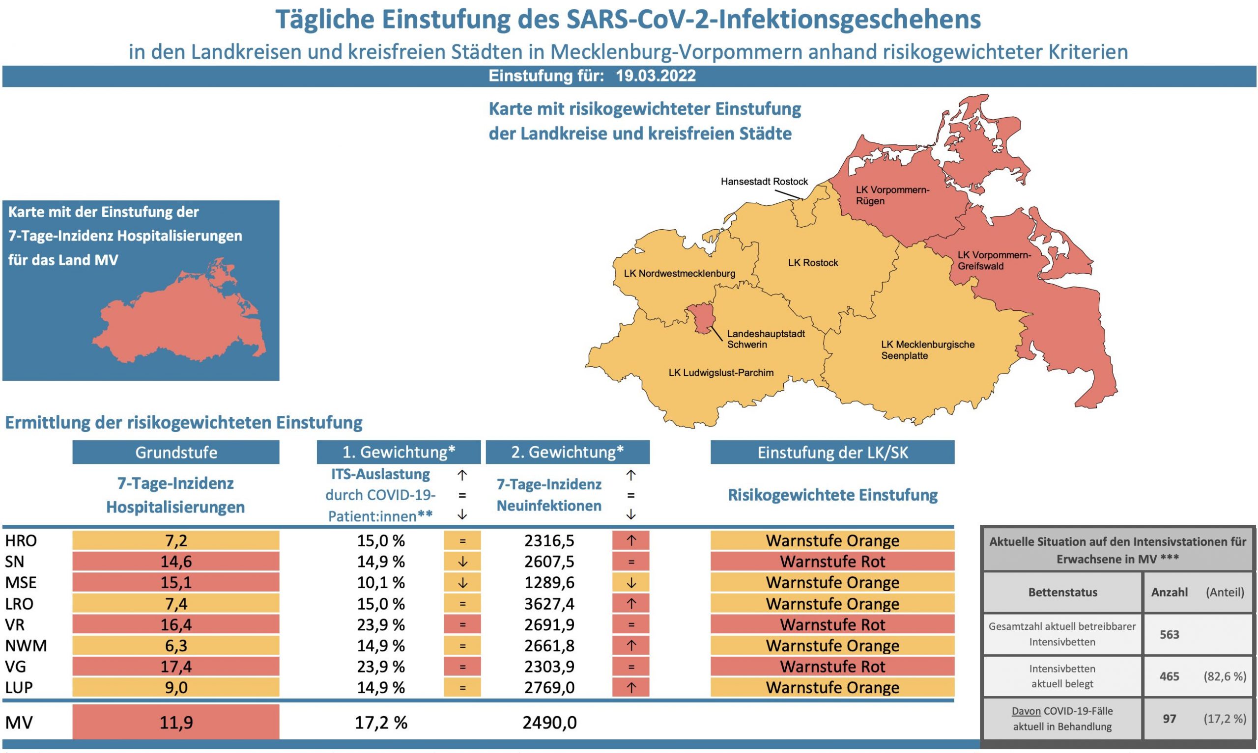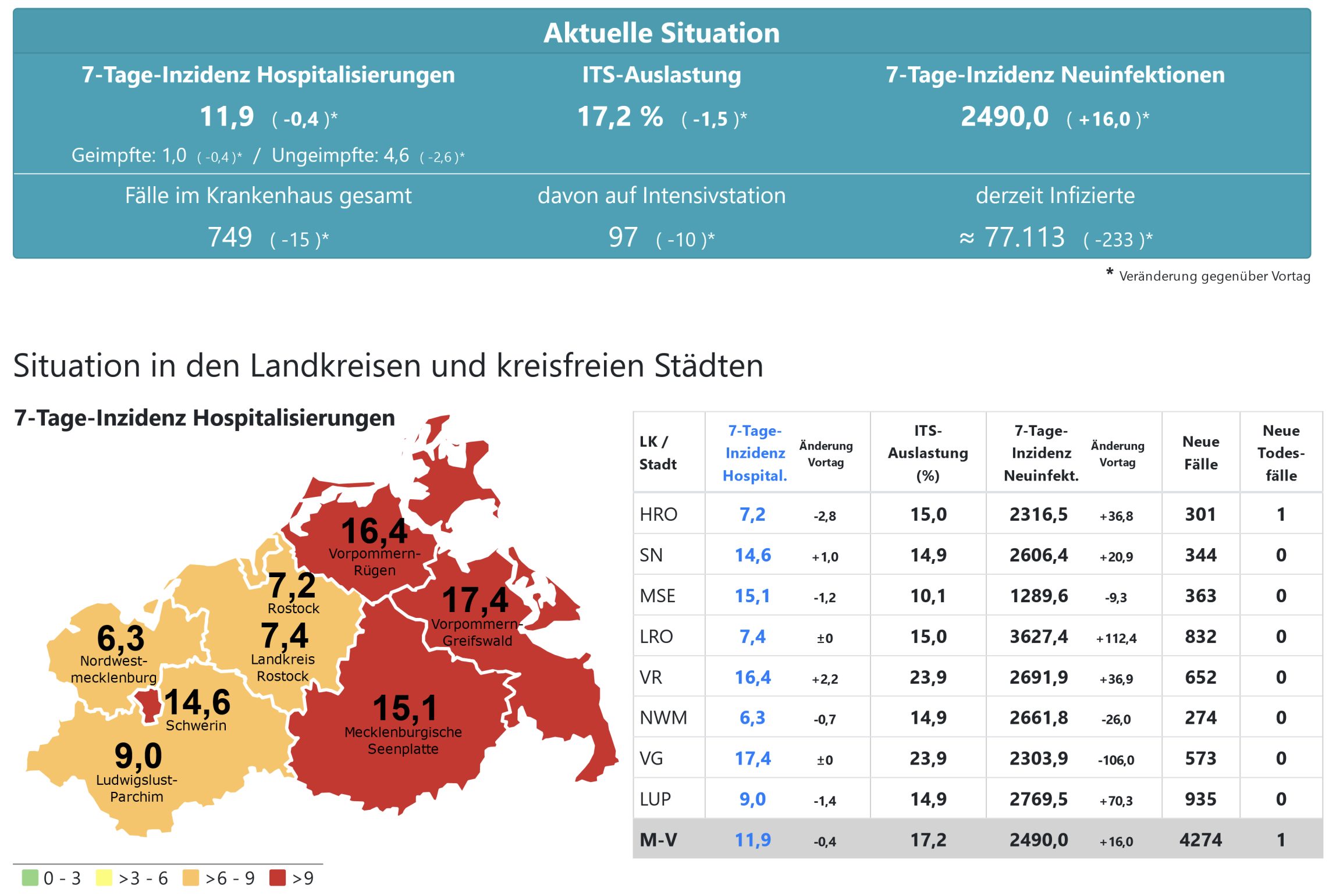 Die Hospitalisierung in ganz Mecklenburg-Vorpommern liegt heute bei 11,9, die Inzidenz des Landes steigt von 2474,0 auf 2490,0. Das Land Mecklenburg-Vorpommern meldet heute 4274 Neuinfektionen und einen neuen Todesfall.