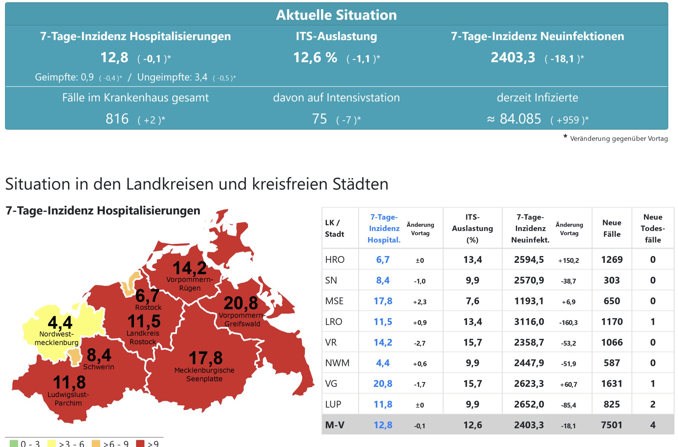 Die Hospitalisierung in ganz Mecklenburg-Vorpommern liegt heute bei 12,8, die Inzidenz des Landes sinkt von 2422,4 auf 2403,3. Das Land Mecklenburg-Vorpommern meldet heute 7501 Neuinfektionen sowie 4 neue Todesfälle.