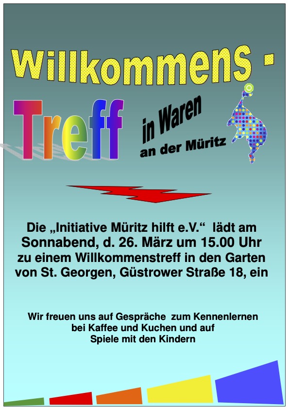 Die Initiative „Müritz hilft“ lädt heute ab 15 Uhr zu einem „Willkommenstreff“ in den Garten der St. Georgengemeinde, Güstrower Straße 18, ein. Die Ehrenamtlichen freuen sich auf gemeinsame Gespräche zum Kennenlernen und Spiele mit den Kindern.