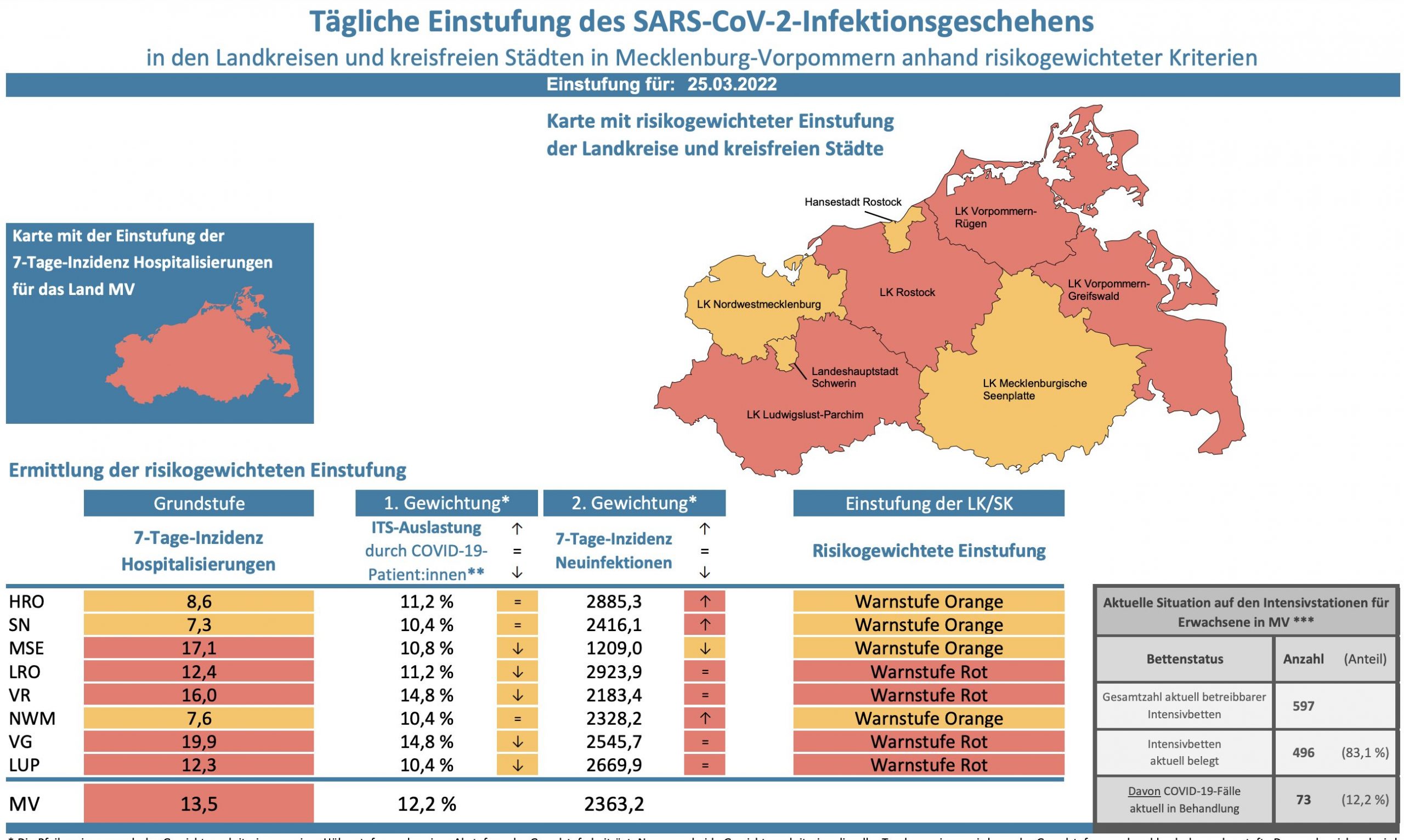 Die Hospitalisierung in ganz Mecklenburg-Vorpommern liegt heute bei 13,5, die Inzidenz des Landes sinkt von 2403,3 auf 2363,2. Das Land Mecklenburg-Vorpommern meldet heute 5662 Neuinfektionen sowie 16 neue Todesfälle.