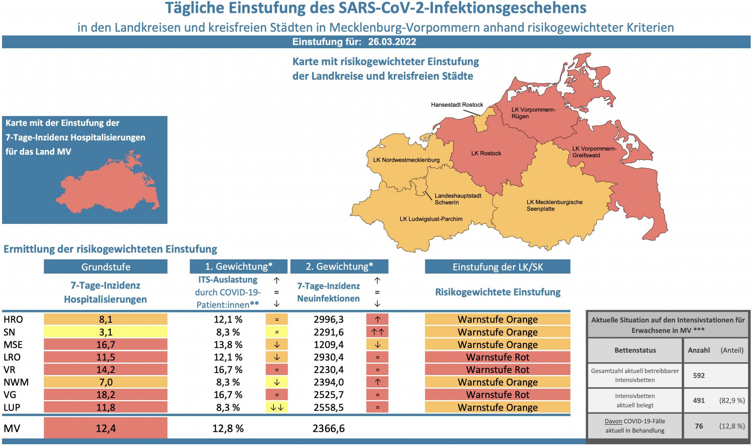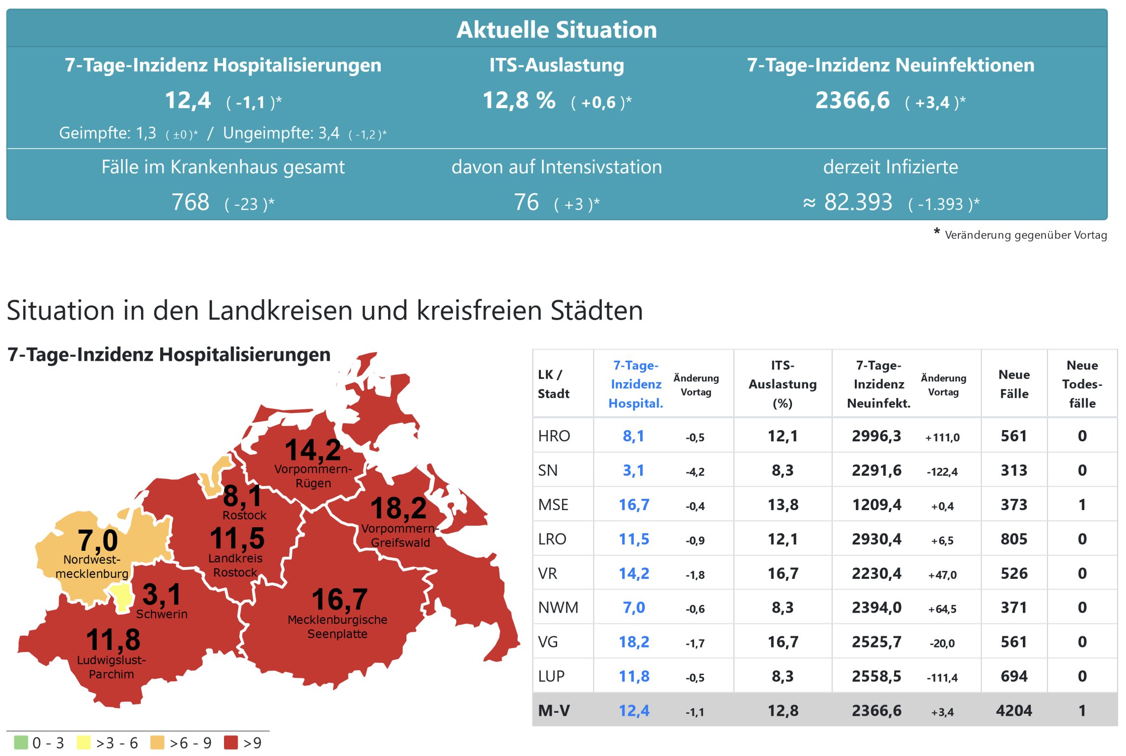 Die Hospitalisierung in ganz Mecklenburg-Vorpommern liegt heute bei 12,4, die Inzidenz des Landes steigt von 2363,2 auf 2366,6. Das Land Mecklenburg-Vorpommern meldet heute 4204 Neuinfektionen sowie einen neuen Todesfall.