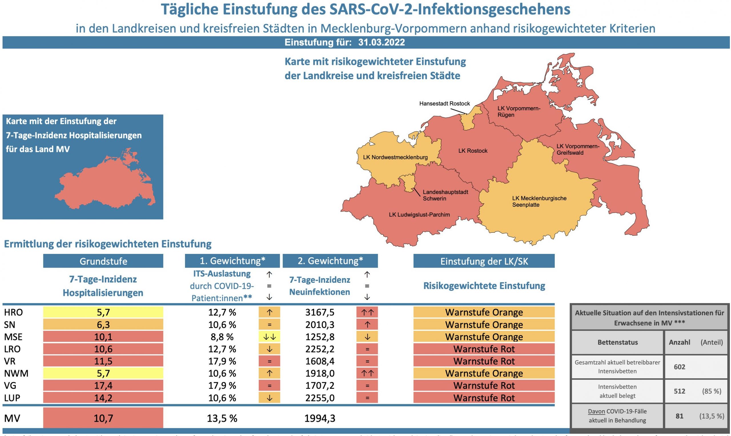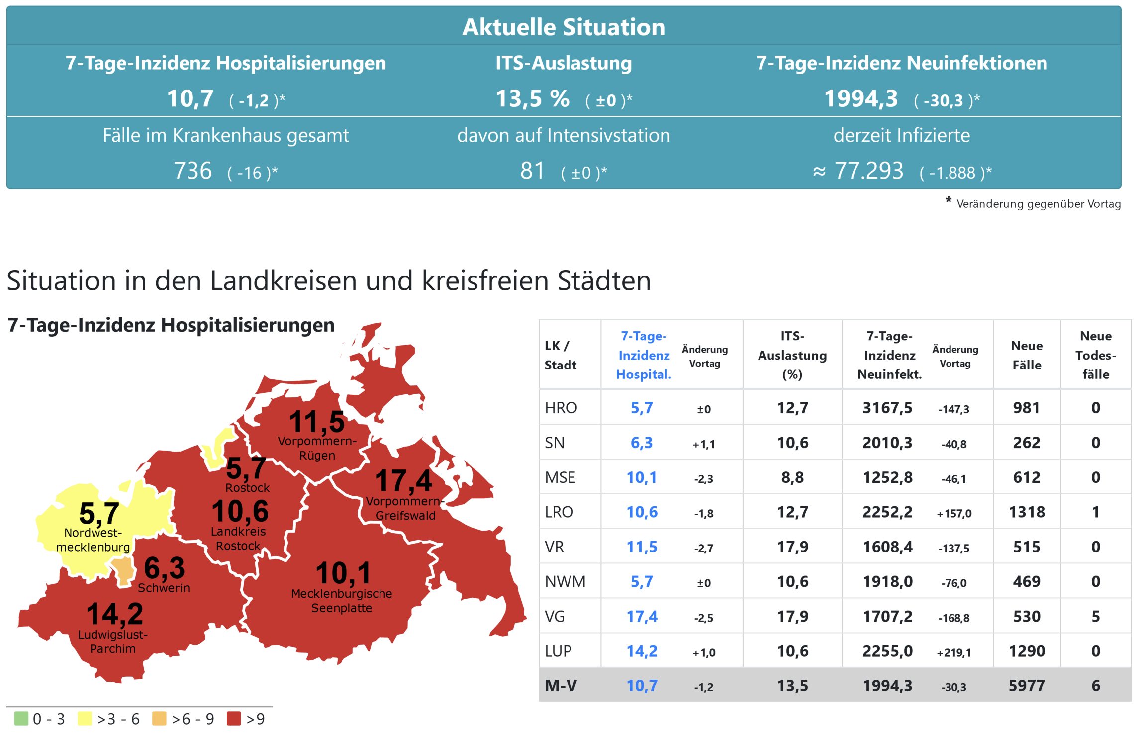 Die Hospitalisierung in ganz Mecklenburg-Vorpommern liegt heute bei 10,7, die Inzidenz des Landes sinkt von 2025,4 auf 1994,3. Das Land Mecklenburg-Vorpommern meldet heute 5977 Neuinfektionen sowie 6 neue Todesfälle.