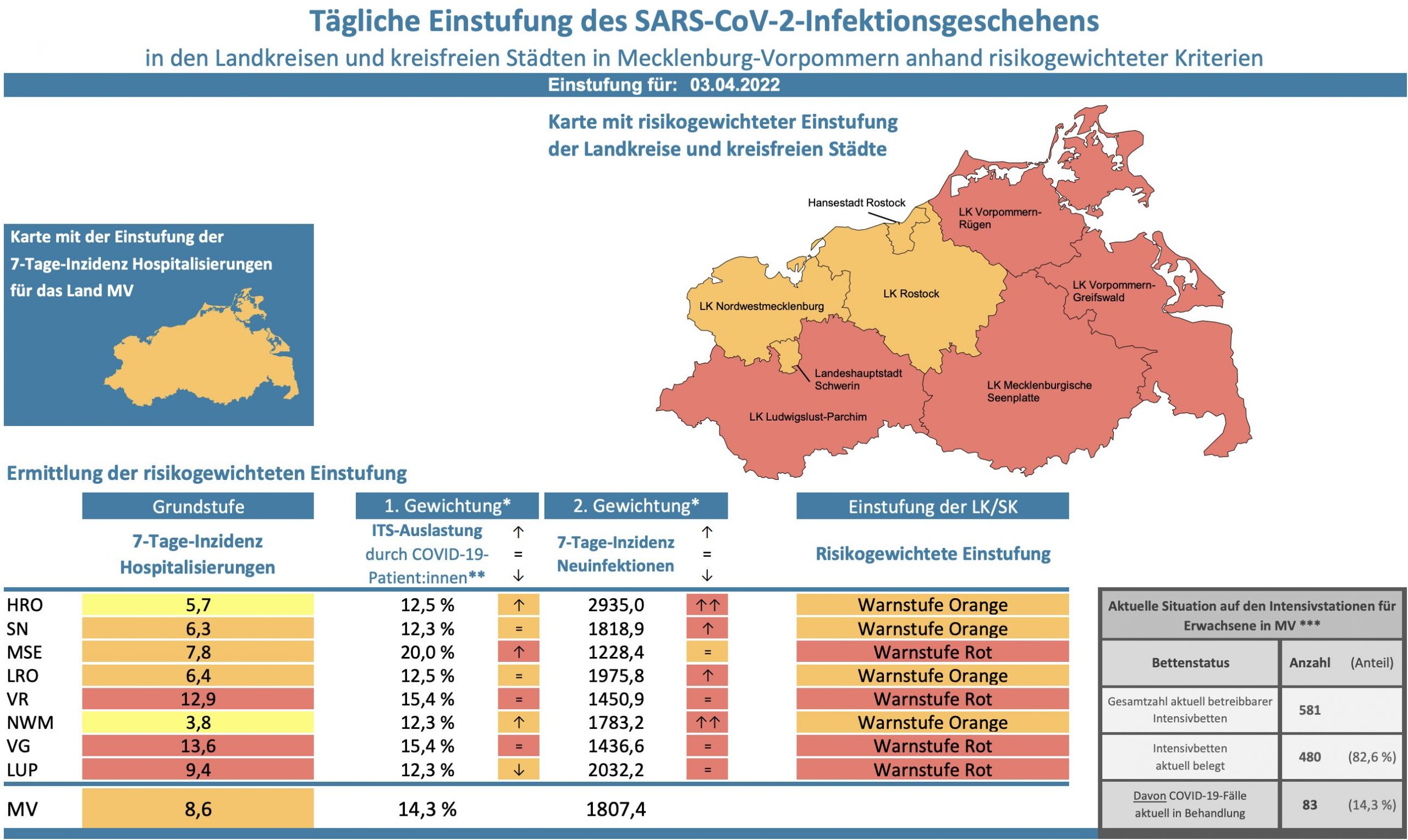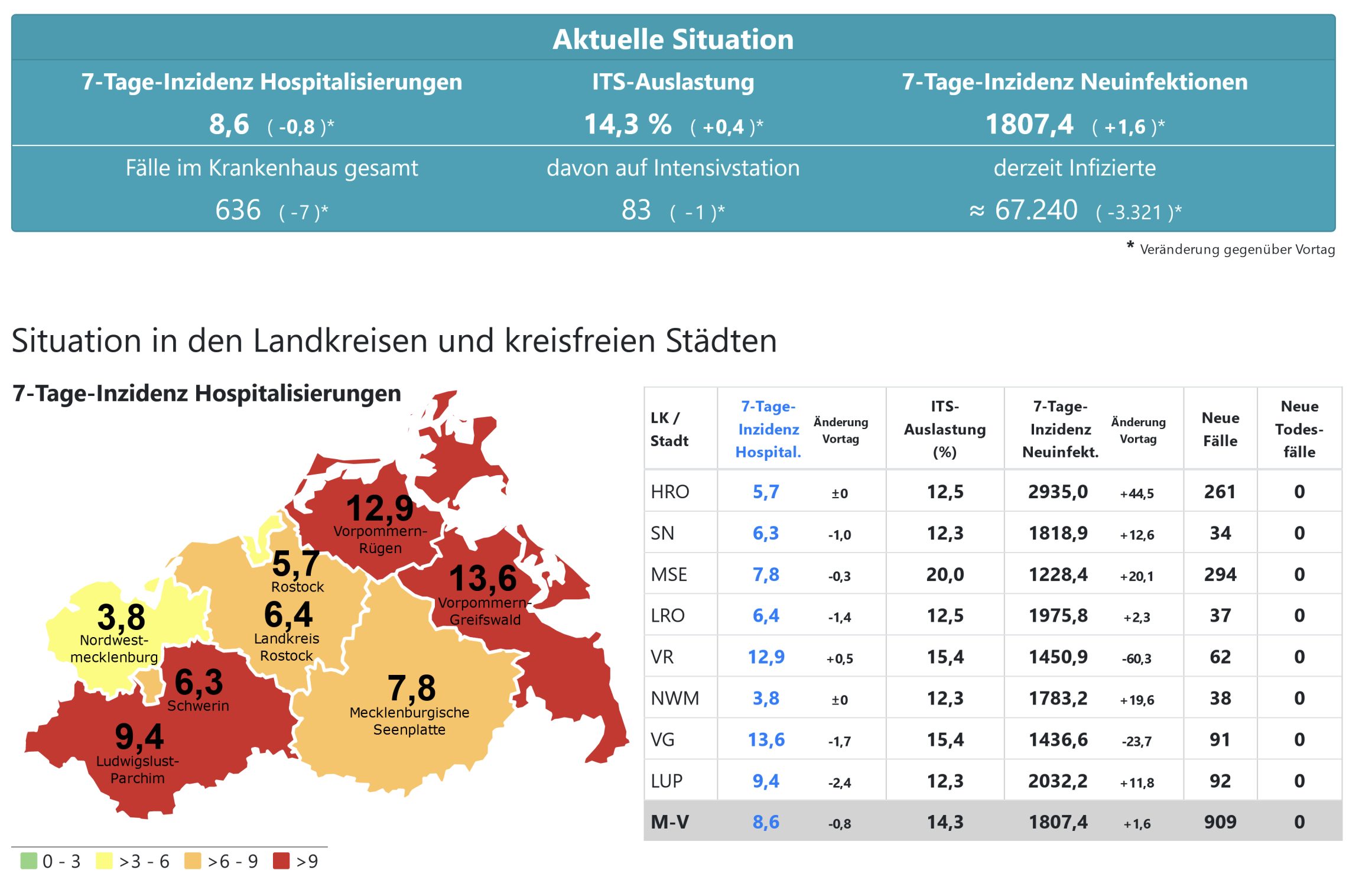 Die Hospitalisierung in ganz Mecklenburg-Vorpommern liegt heute bei 8,6, die Inzidenz des Landes sinkt von 1890,6 am Freitag auf 1807,4. Das Land Mecklenburg-Vorpommern meldet heute 909 Neuinfektionen und keinen neuen Todesfall.