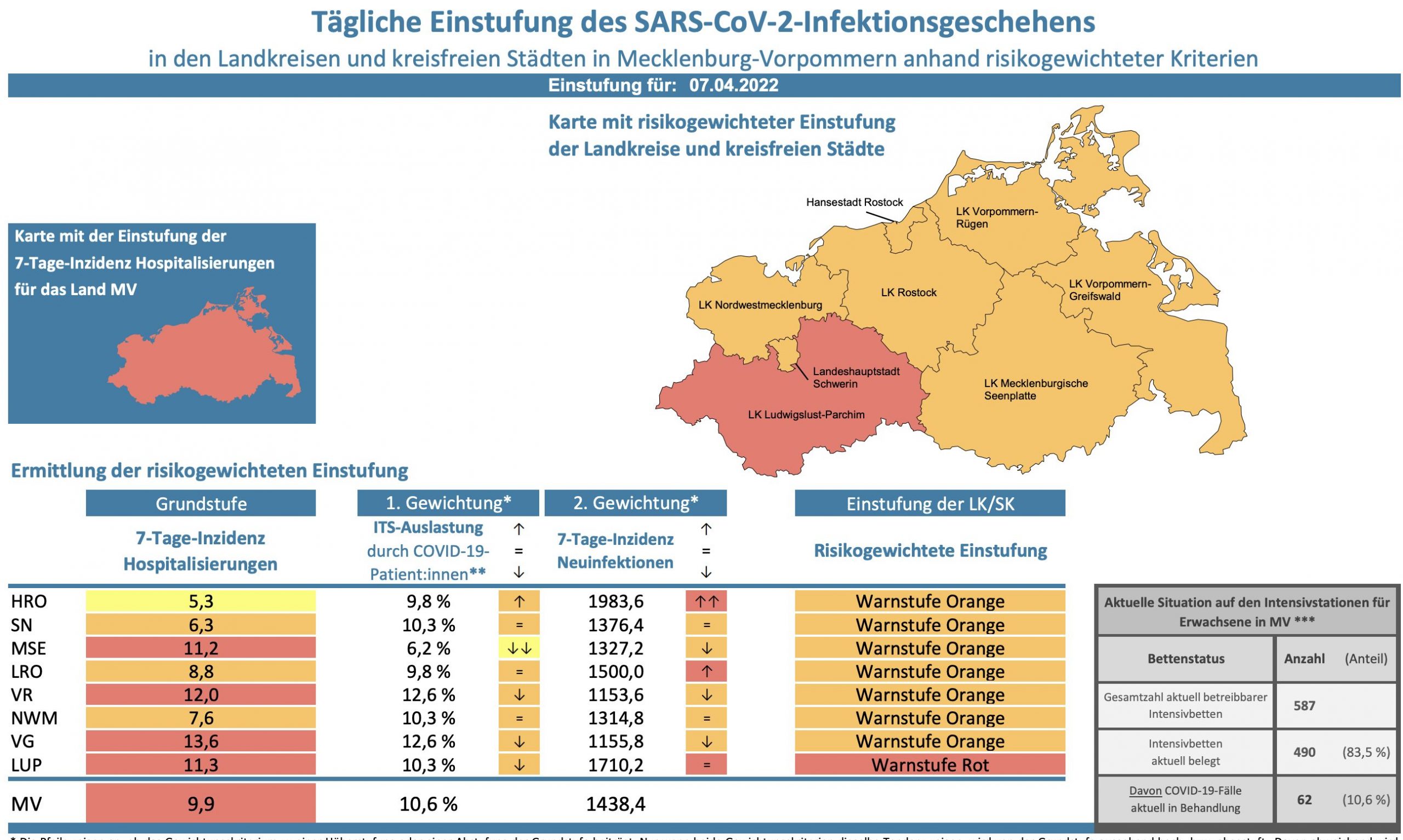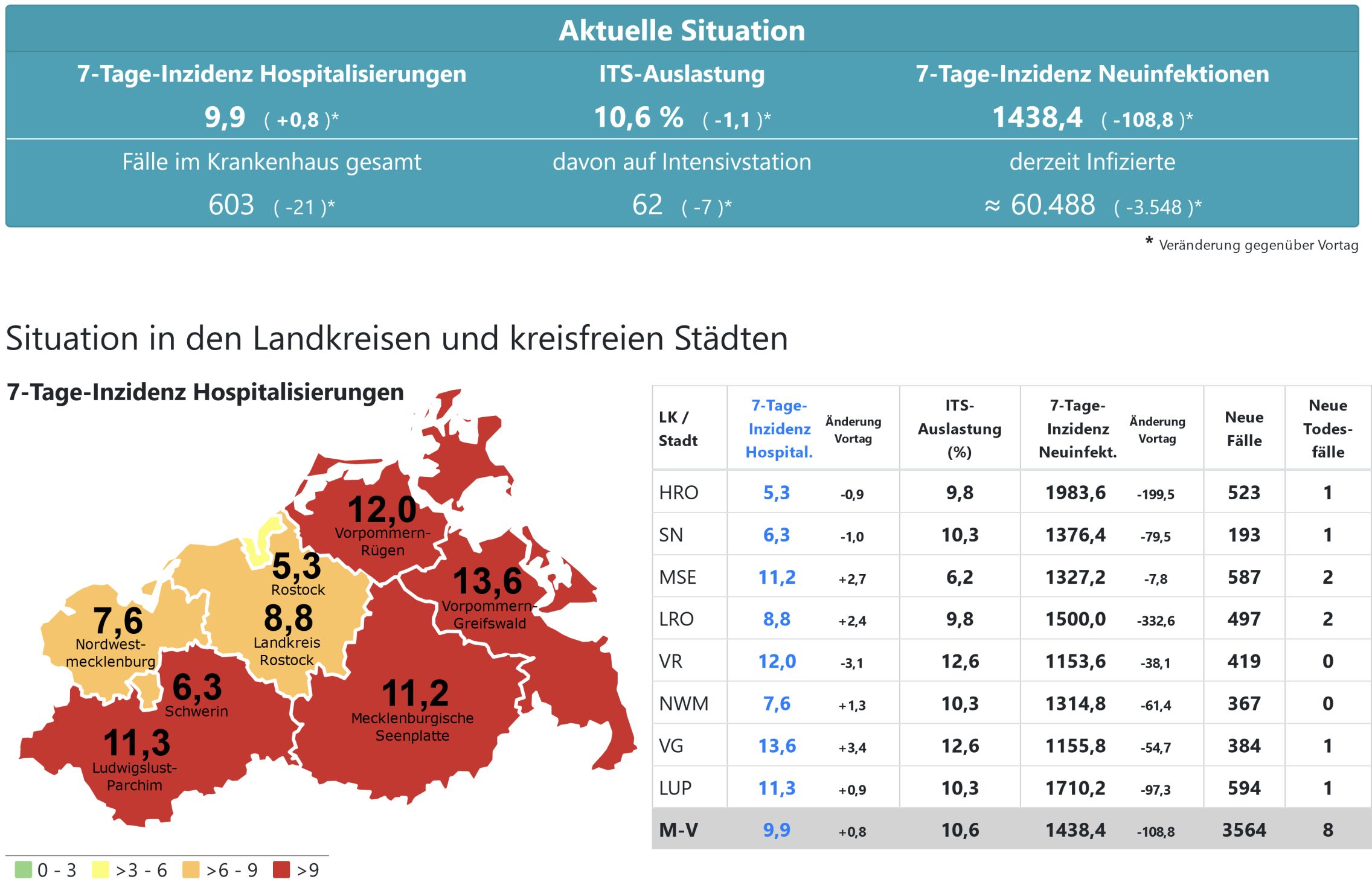 Die Hospitalisierung in ganz Mecklenburg-Vorpommern liegt heute bei 9,9, die Inzidenz des Landes sinkt von 1547,8 auf 1438,4. Das Land Mecklenburg-Vorpommern meldet heute 3564 Neuinfektionen und 8 neue Todesfälle.