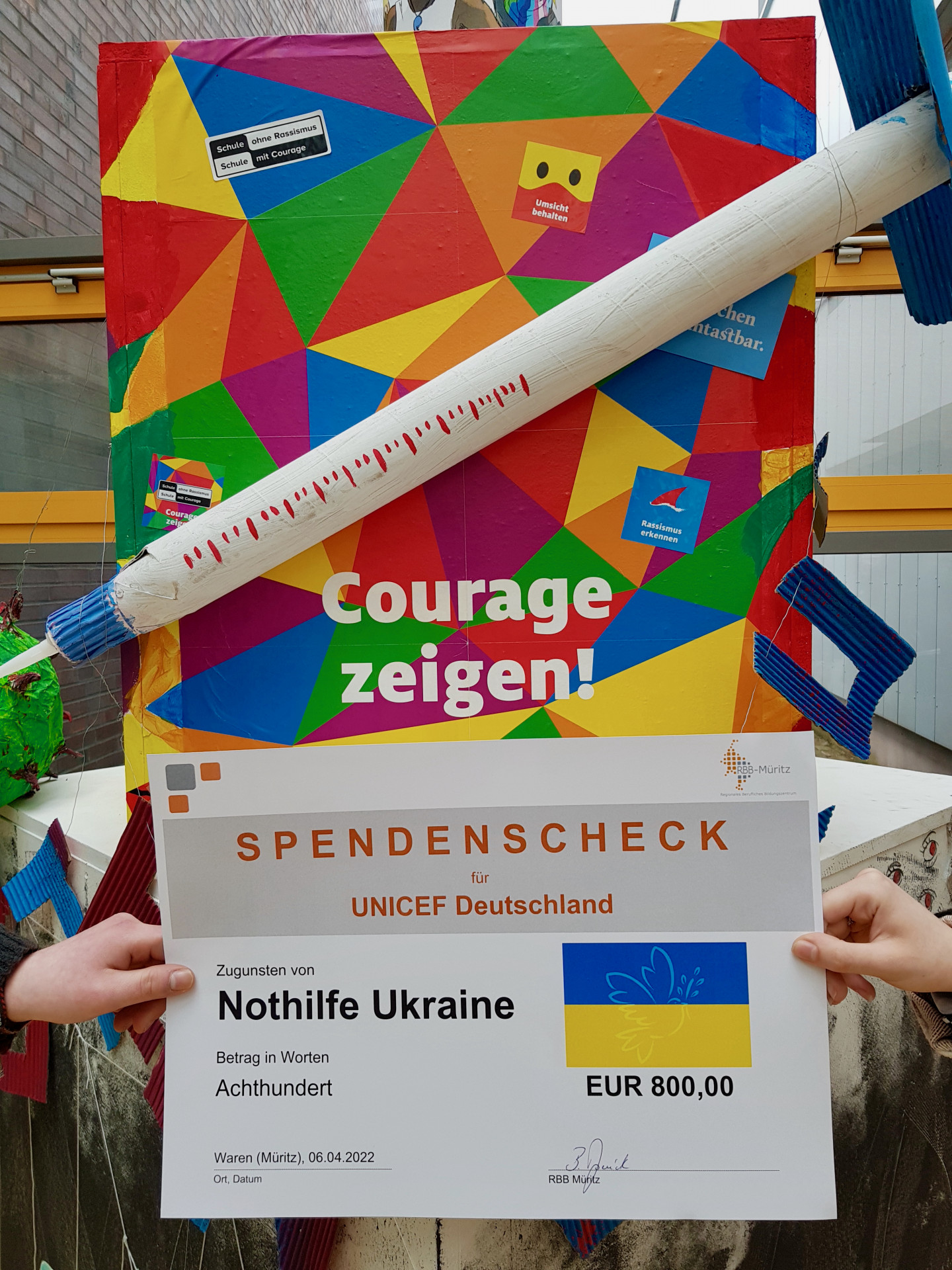 Am RBB Müritz gab es vor kurzem den Projekttag „Schule ohne Rassismus-Schule mit Courage“. Um ein Zeichen gegen jegliche Art von Rassismus und Diskriminierung zu setzen und um auf aktuell gesellschaftliche Probleme aufmerksam zu machen, wurden über den Tag verteilt verschiedene Workshops, Informationsveranstaltungen und Ausstellungen organisiert. Jedoch ein Thema aus diesem Bereich beschäftigt zurzeit die ganze Welt und auch die Schüler des RBB Müritz: der Krieg in der Ukraine. Insbesondere die Gewalt und das damit verbundene Leid und die ungewisse Zukunft der unschuldigen Kinder, Jugendlichen und Erwachsenen in der Ukraine verurteilen sie zutiefst. Keiner kann und will sich vorstellen einmal in so einer Situation leben zu müssen. Deshalb wollten die Schüler Solidarität und Verbundenheit zeigen und insbesondere die vielen Kinder unterstützen, die durch die gewaltvollen Konflikte in der Ukraine in Gefahr sind.