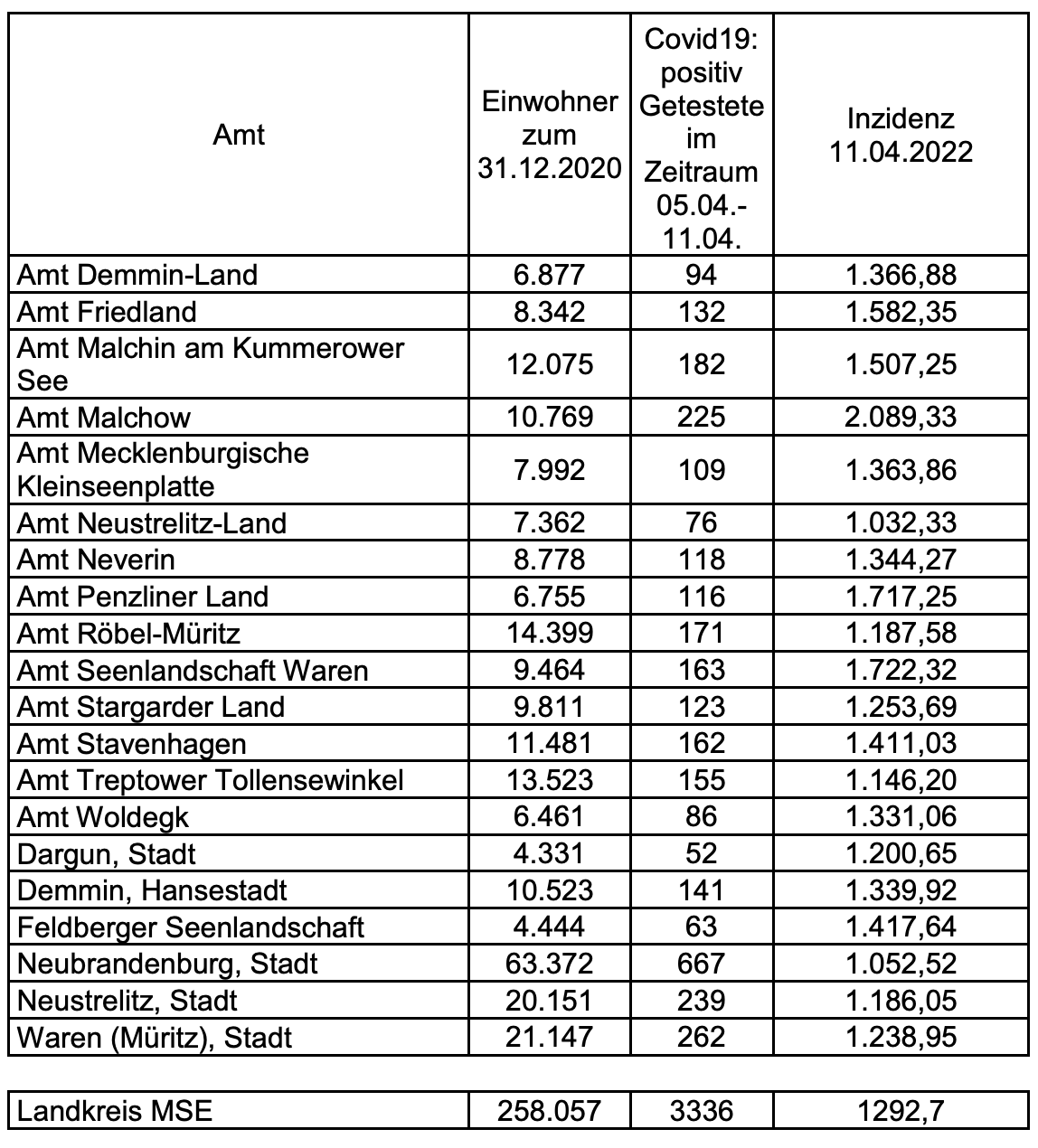 In diesem Artikel finden Sie auch wieder die Inzidenzen des Landkreises Mecklenburgische Seenplatte – unterteilt nach Städten und Ämtern. Demnach hat das Amt Malchow derzeit eine Inzidenz von 2089,33, das Amt Penzliner Land von 1717,25, das Amt Röbel-Müritz von 1187,58, das Amt Seenlanschaft Waren von 1722,32 und die Stadt Waren von 1238,95.