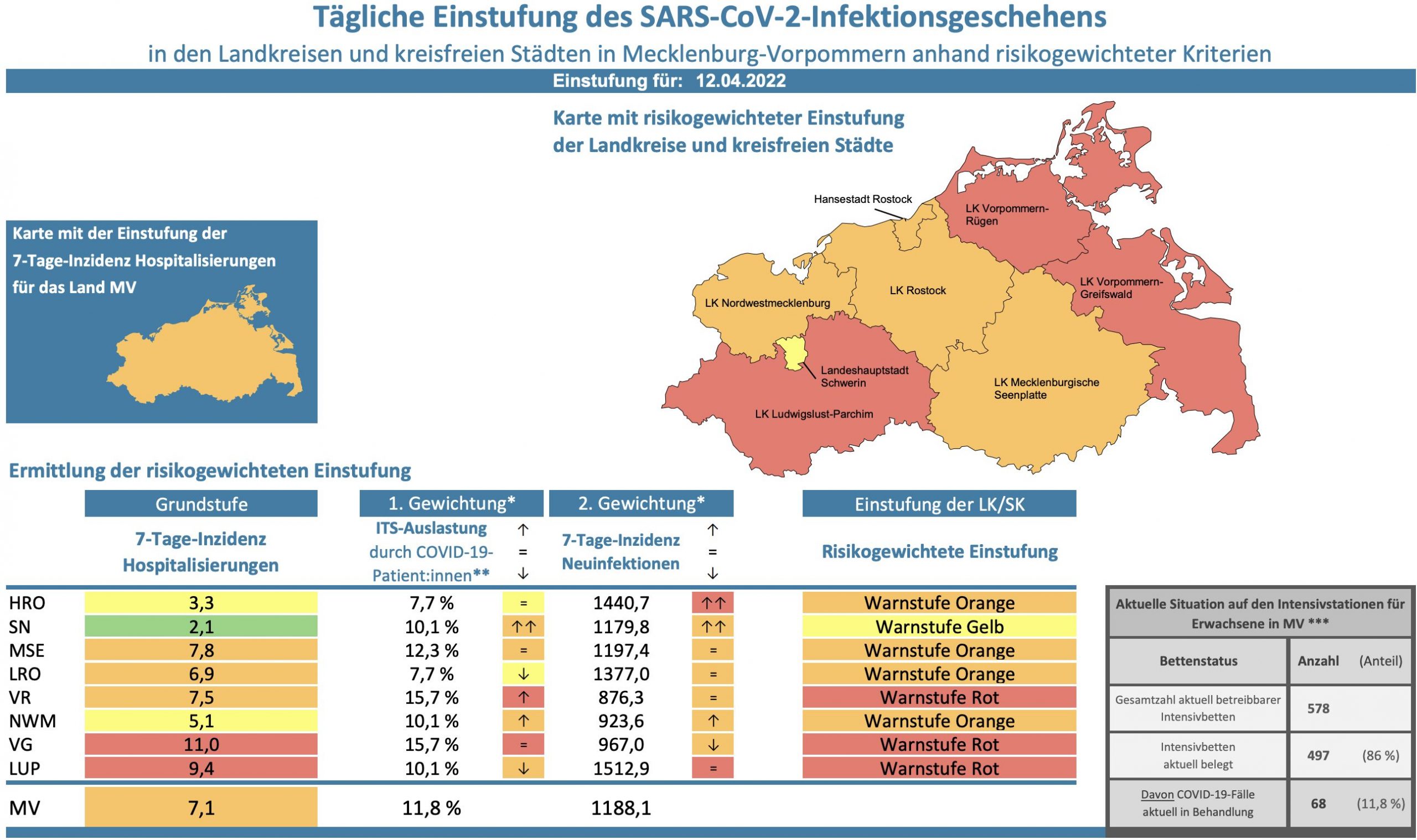 Die Hospitalisierung in ganz Mecklenburg-Vorpommern liegt heute bei 7,1, die Inzidenz des Landes sinkt von 1345,4 auf 1188,1. Das Land Mecklenburg-Vorpommern meldet heute 3569 Neuinfektionen und 12 neue Todesfälle.