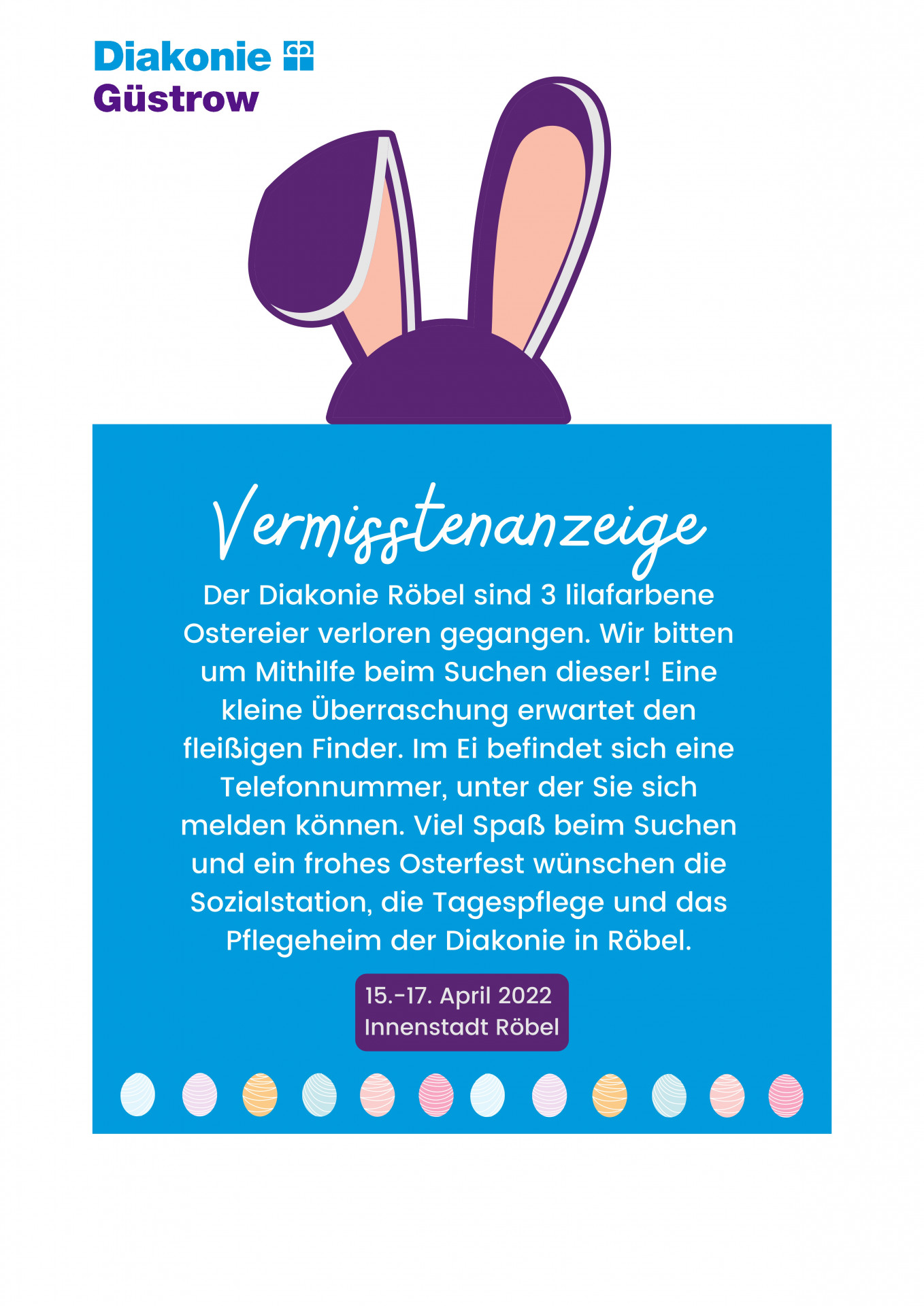 Am Osterwochenende ist in Röbel der Osterhase unterwegs und versteckt in der Innenstadt drei lila Eier. Die fleißigen Finder erwartet ein österlicher Präsentkorb, zusammengestellt von den Diakonie-Einrichtungen aus Röbel – Sozialstation, Tagespflege, Pflegeheim).