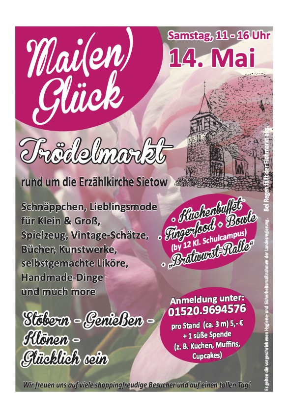 Nach dem erfolgreichen Saisonstart im März geht’s für die Flohmarktfreunde im Mai in die nächste Runde. Am 14. Mai ist rings um die Erzählkirche in Sietow wieder ein Trödelmarkt geplant, Anmeldungen sind noch möglich.