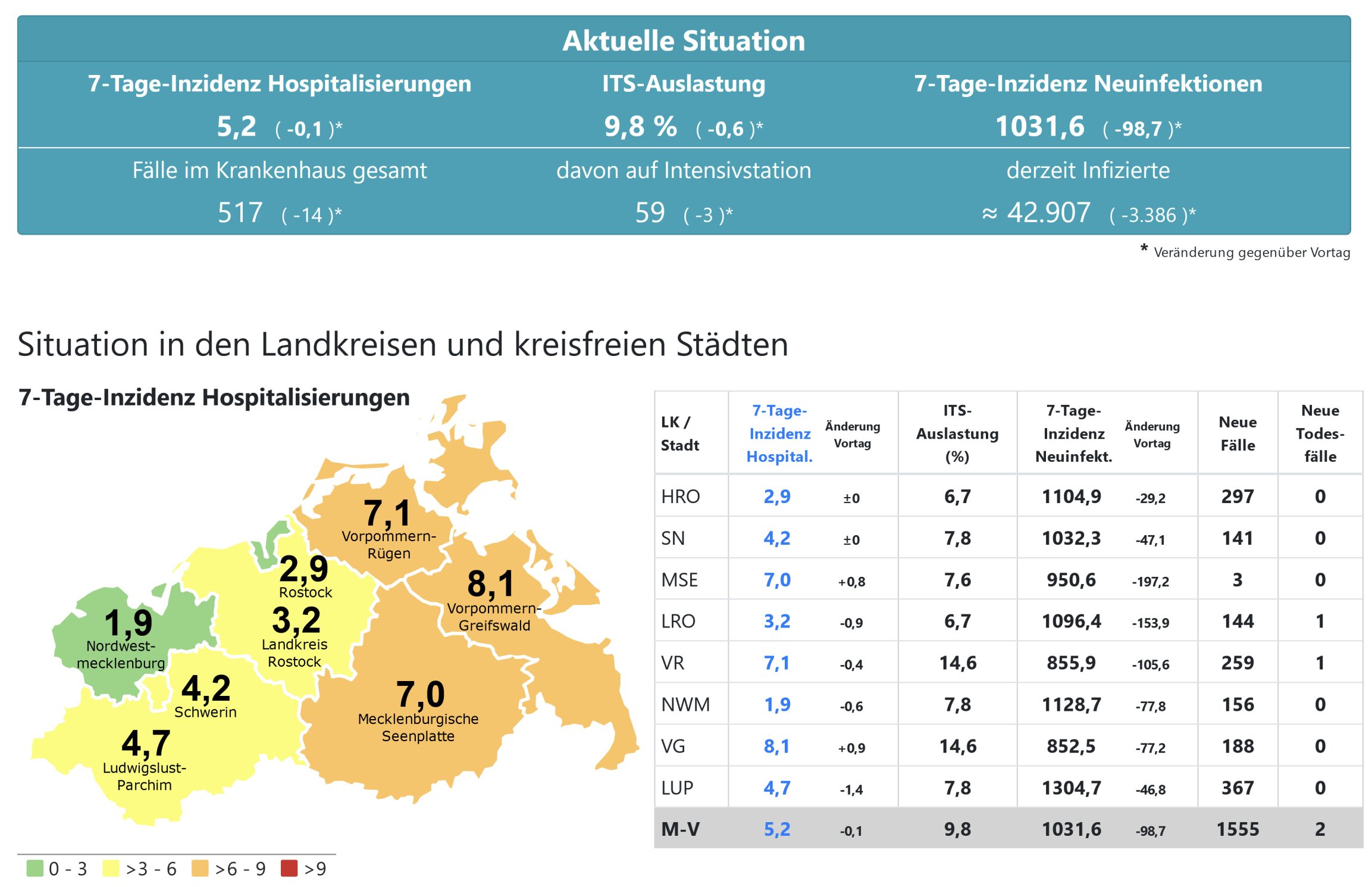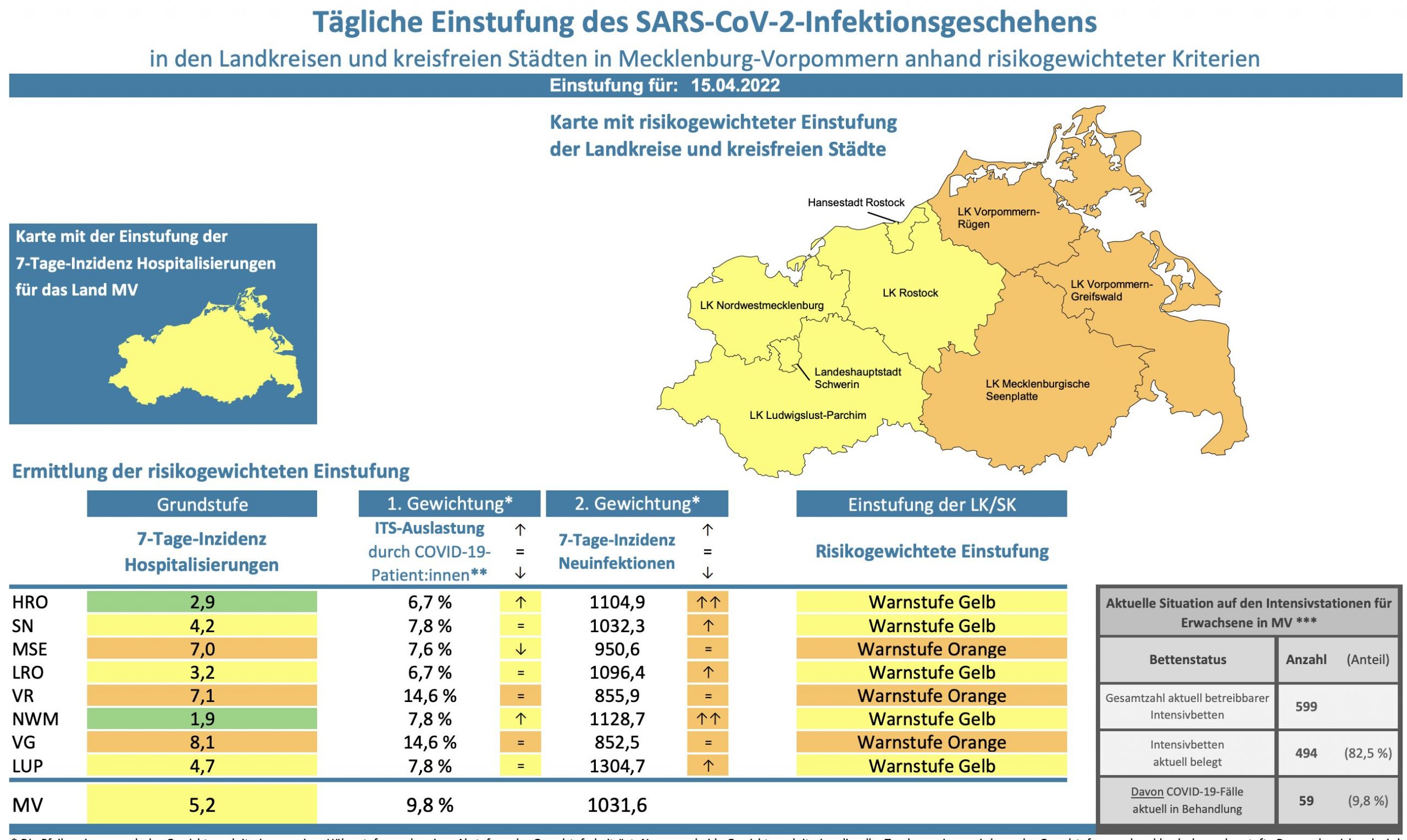 Die Hospitalisierung in ganz Mecklenburg-Vorpommern liegt heute bei 5,2, die Inzidenz des Landes sinkt von 1130,5 auf 1031,6. Das Land Mecklenburg-Vorpommern meldet heute 1555 Neuinfektionen und 2 neue Todesfälle.