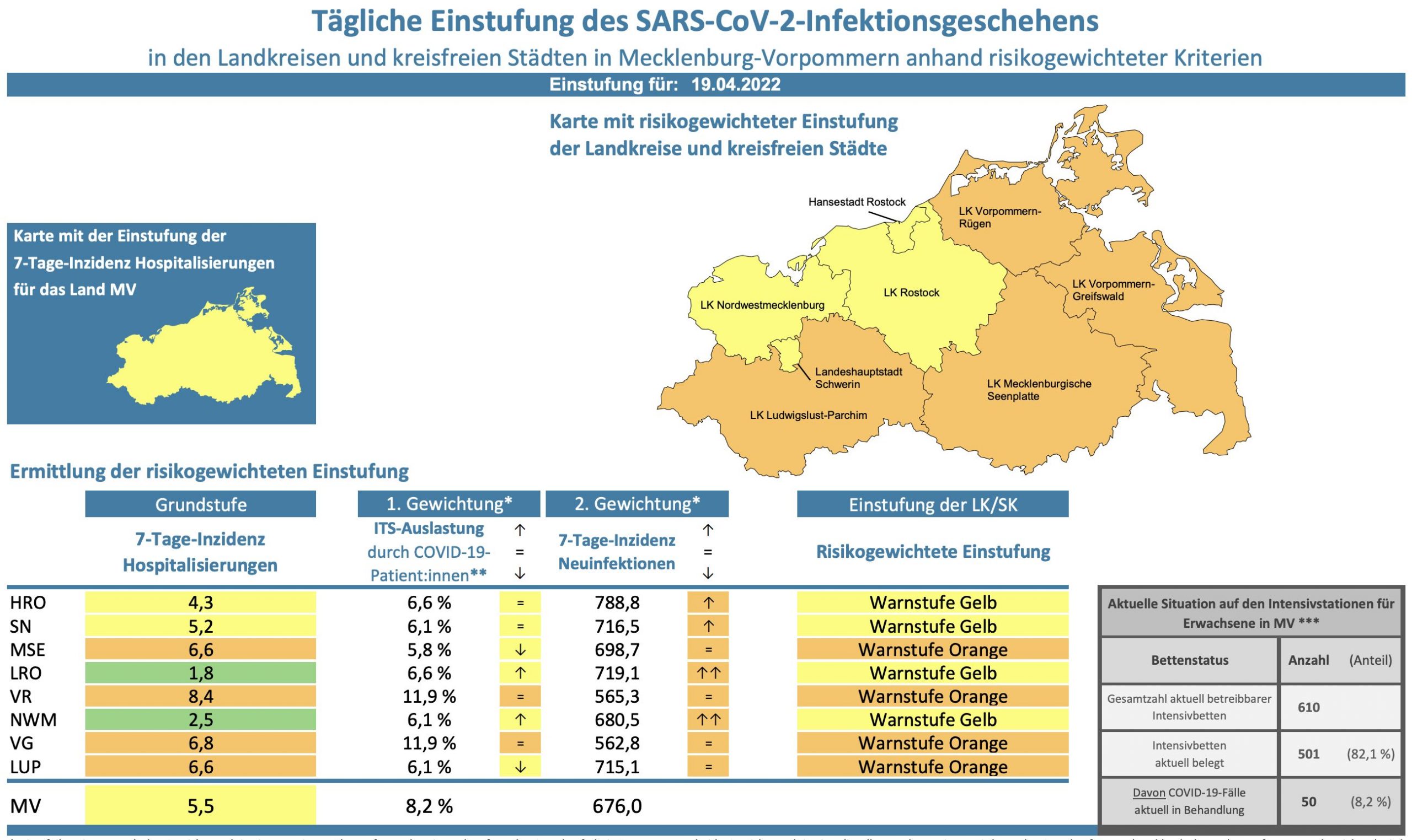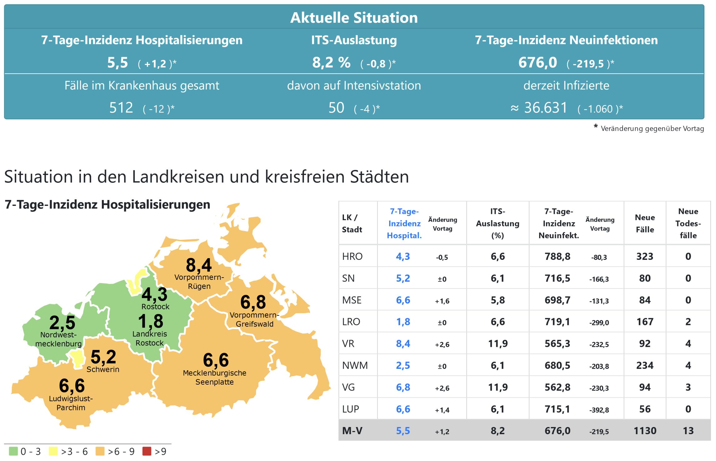 Die Hospitalisierung in ganz Mecklenburg-Vorpommern liegt heute bei 5,5, die Inzidenz des Landes sinkt auf 676. Das Land Mecklenburg-Vorpommern meldet heute 1130 Neuinfektionen und 13 neue Todesfälle.