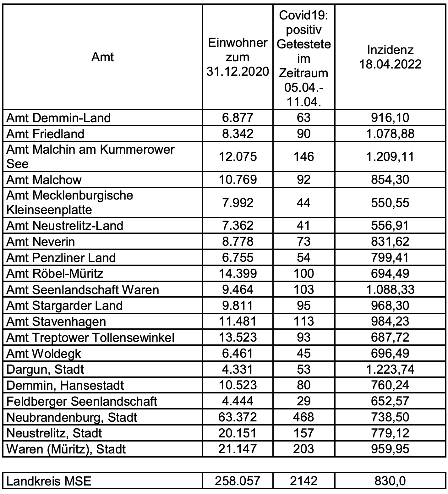 Der Hospitalisierungswert des Landkreises Mecklenburgische Seenplatte liegt heute bei 6,6, die Auslastung der Intensivstationen wird mit 5,8 Prozent angegeben. Der Landkreis meldet heute keinen neuen Todesfall.