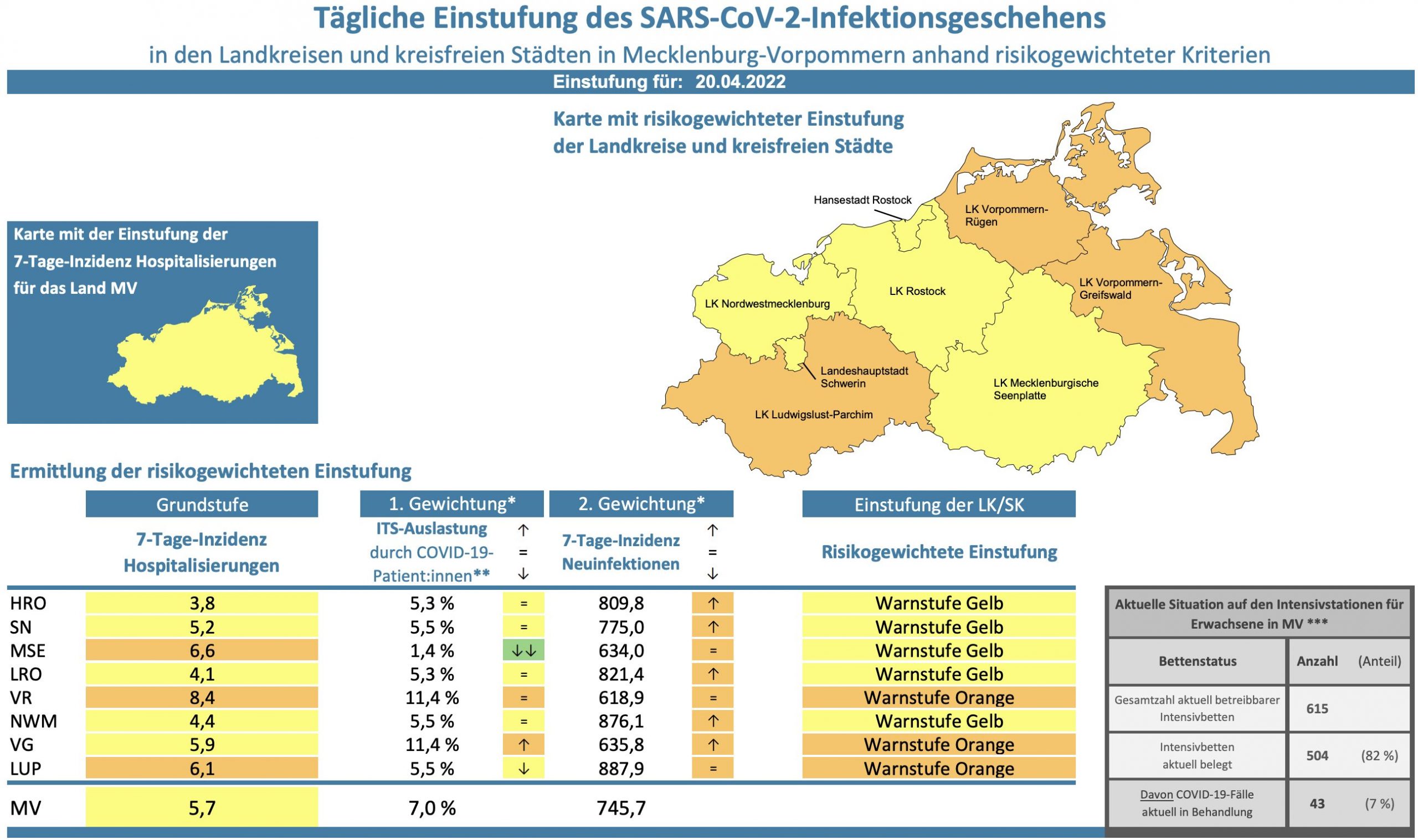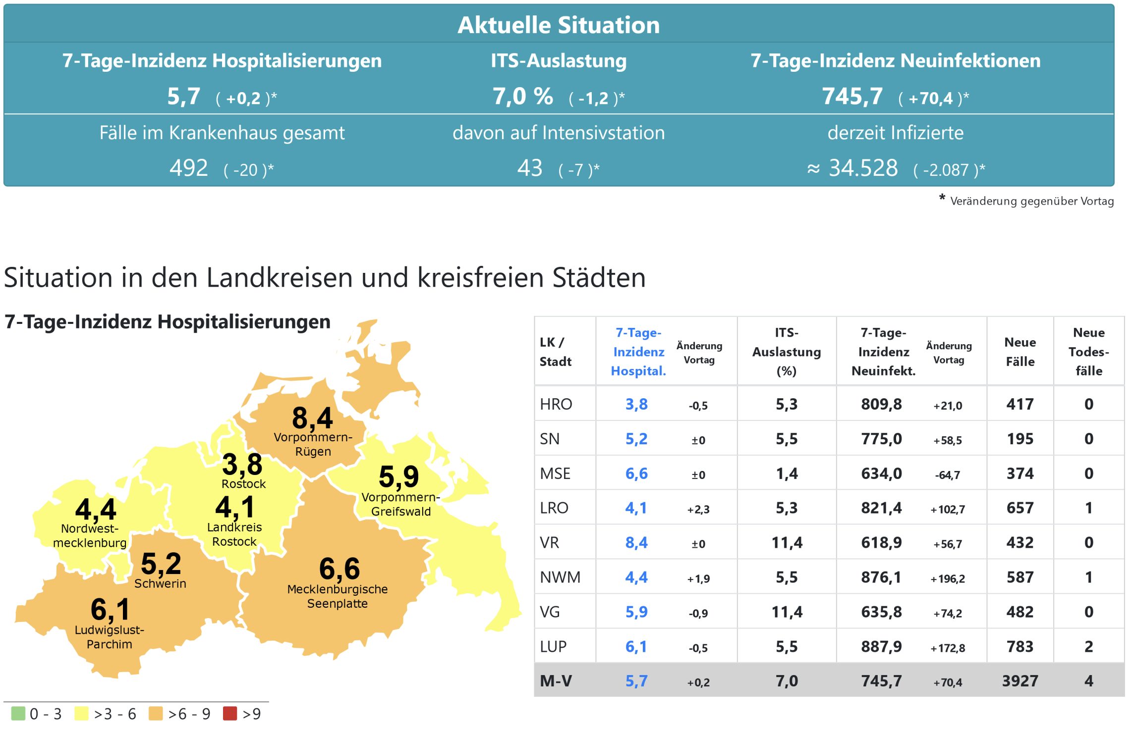 Die Hospitalisierung in ganz Mecklenburg-Vorpommern liegt heute bei 5,7, die Inzidenz des Landes steigt von 676 auf 745,7. Das Land Mecklenburg-Vorpommern meldet heute 3927 Neuinfektionen und 4 neue Todesfälle.