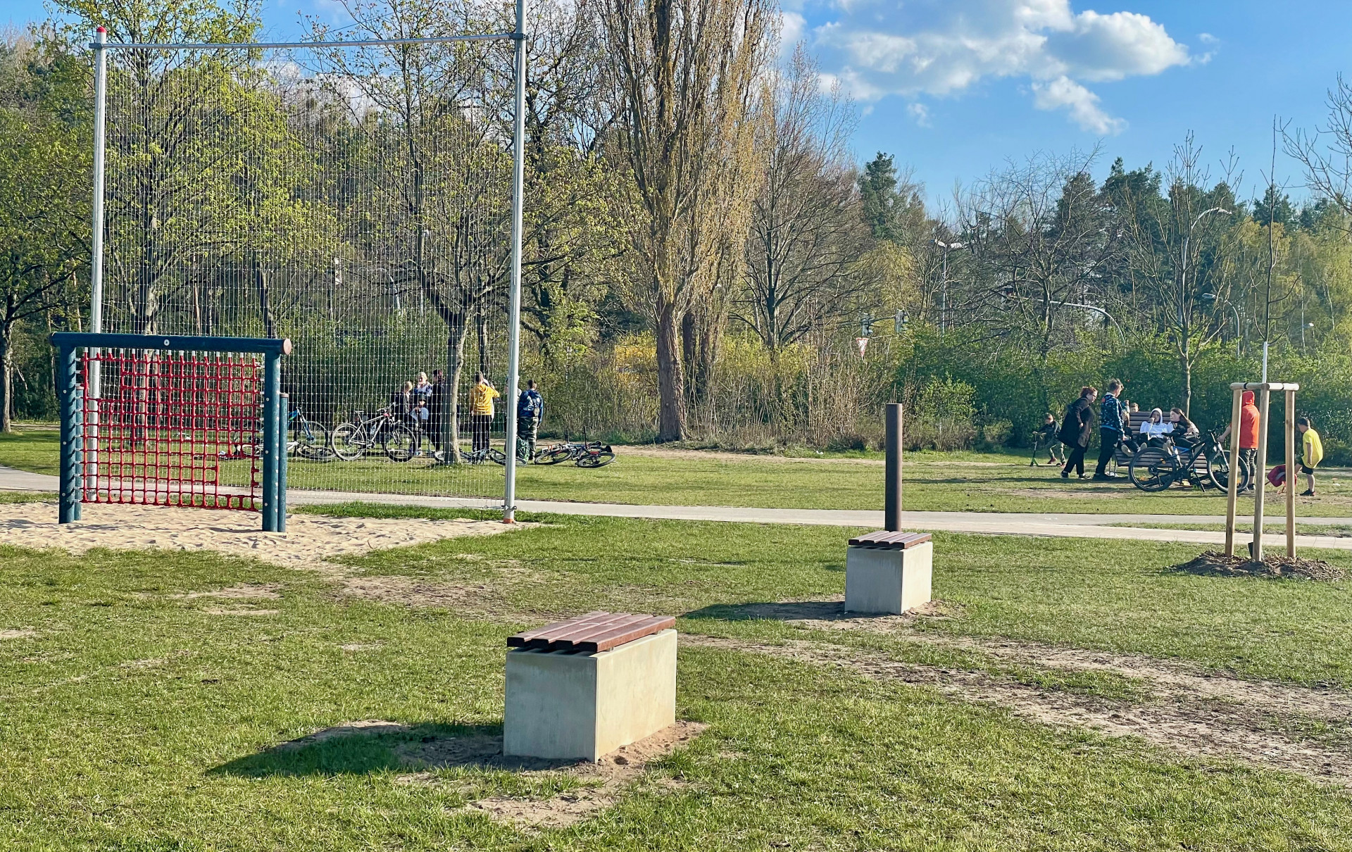 Die vorhandene Skaterbahn wurde instand gesetzt, die Wegeführung angepasst und eine neue Asphaltfläche mit diversen Anfahr-Rampen hergestellt. Außerdem gibt es jetzt einen Bolzplatz mit zwei Toren, auf denen man auch herum klettern kann, eine Ballfang-Anlage sowie eine Calisthenics-Anlage.