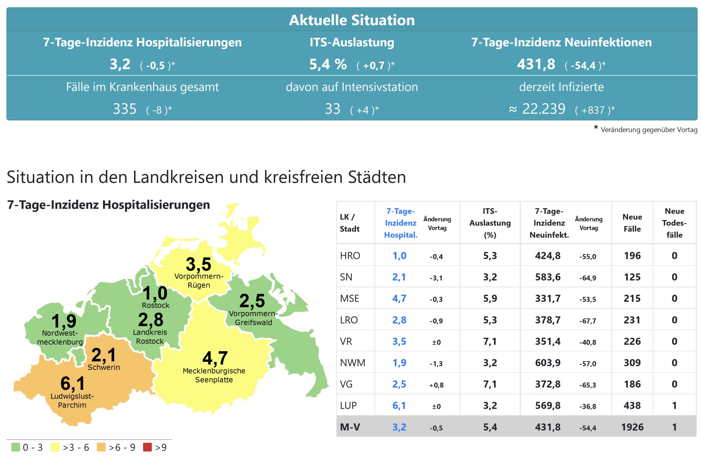 Die Hospitalisierung in ganz Mecklenburg-Vorpommern liegt heute bei 3,2, die Inzidenz des Landes bei 431,8. Das Land Mecklenburg-Vorpommern meldet heute 1926 Neuinfektionen und einen neuen Todesfall.