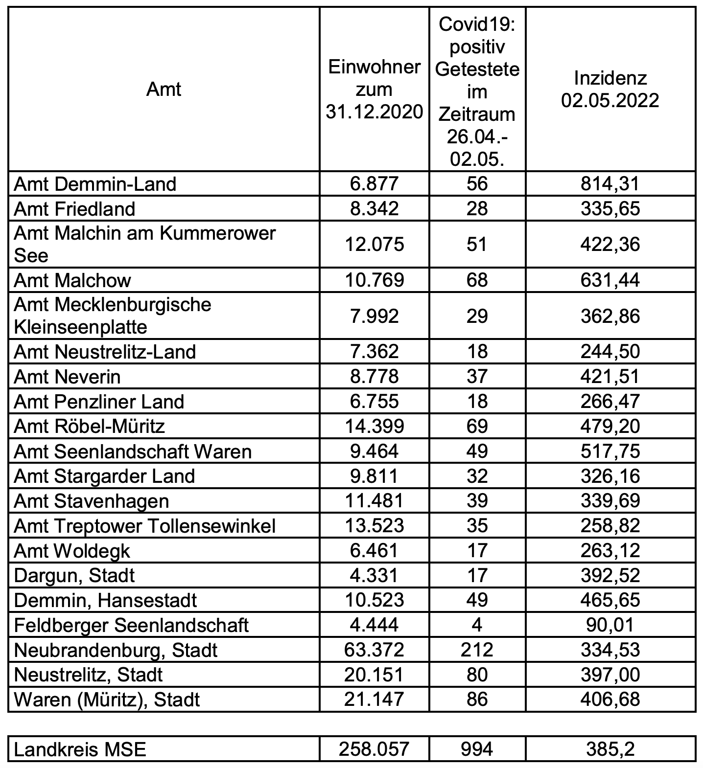 Die Inzidenz des Landkreises Mecklenburgische Seenplatte liegt heute bei 331,7. Für den Landkreis werden heute 215 Neuinfektionen gemeldet. Im heutigen Artikel veröffentlichen wir wieder die Inzidenzen des Landkreises für die einzelnen Städte und Ämter. Demnach liegt die Inzidenz im Amt Malchow bei 631,44, im Amt Penzliner Land bei 266,47, im Amt Röbel-Müritz bei 479,20, im Amt Seenlandschaft Waren bei 517,75 und in der Stadt Waren bei 406,68.
