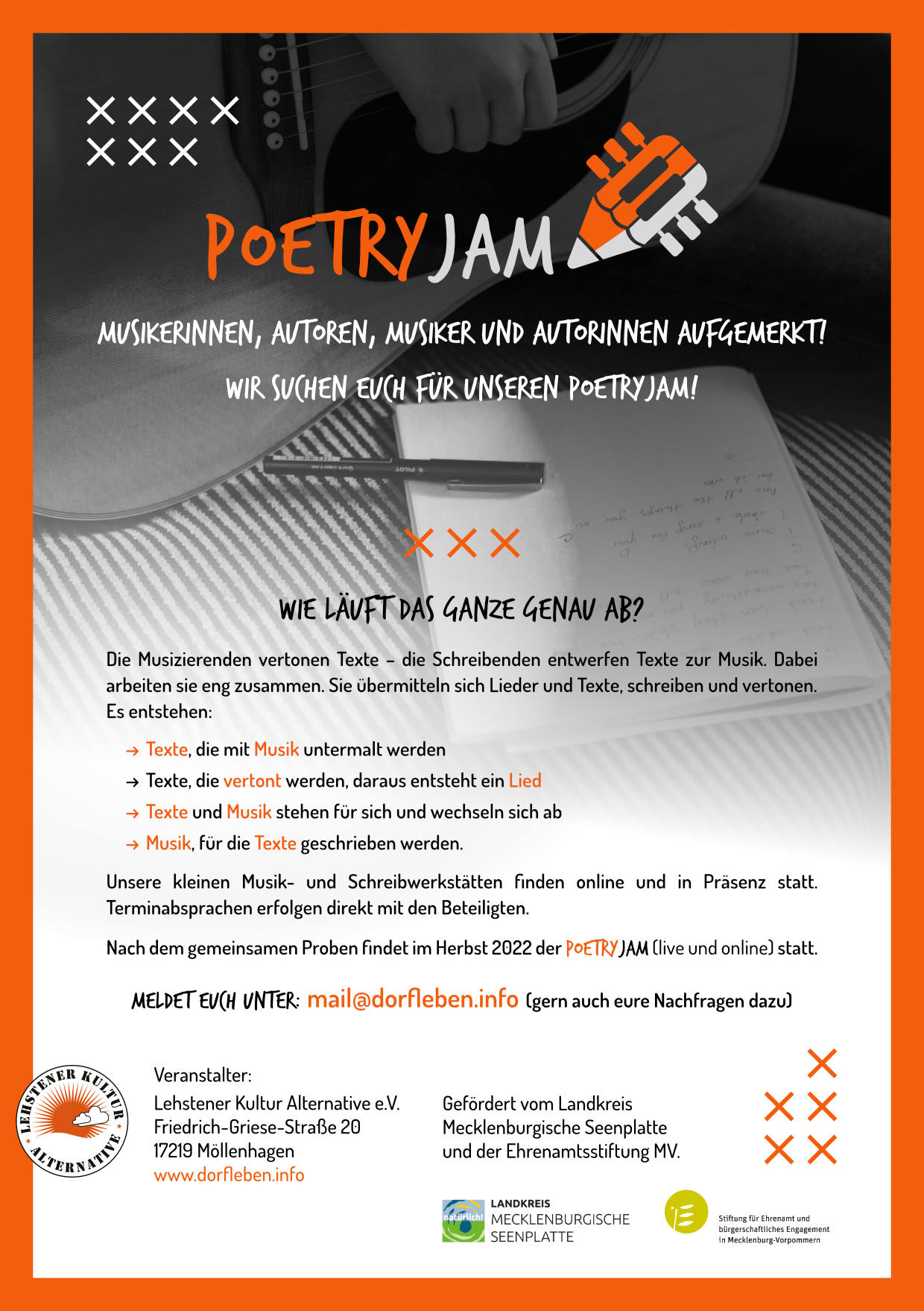 Die Werkstätten finden online und in Präsenz statt. Terminabsprachen erfolgen direkt mit den Interessierten. Nach dem gemeinsamen Proben findet im Herbst 2022 der Poetry jam (live und online) statt.
