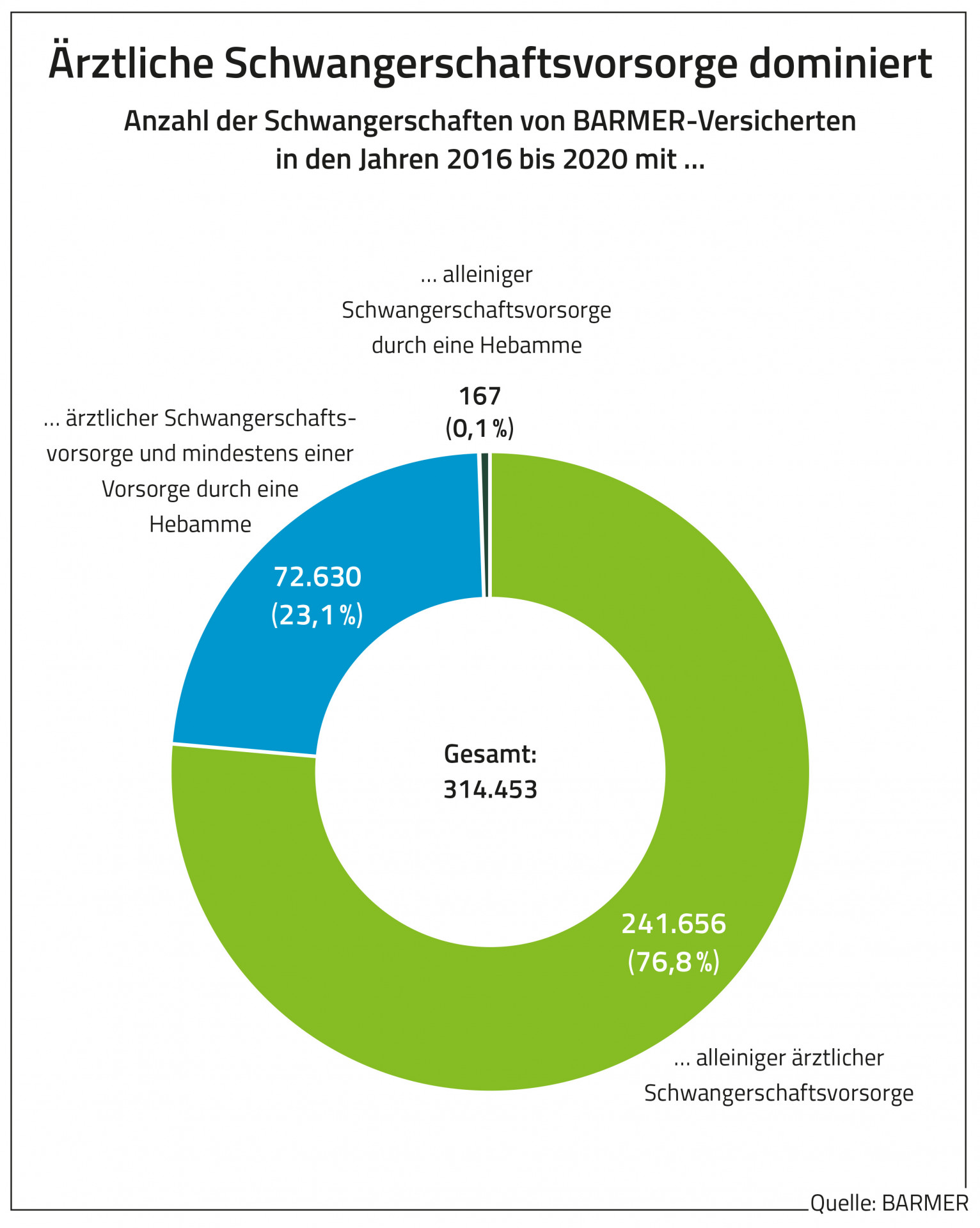 Von insgesamt rund 315.000 schwangeren BARMER-Versicherten nehmen drei Viertel die Vorsorgeleistungen ausschließlich in Arztpraxen und ohne Beteiligung einer Hebamme in Anspruch. In 23 Prozent der Fälle erfolgt die Vorsorge bei beiden Berufsgruppen. Weniger als ein Prozent der Frauen vertraut allein auf eine Hebamme. Das geht aus einer aktuellen Analyse des BARMER Instituts für Gesundheitssystemforschung (bifg) hervor. Ausgewertet wurden Abrechnungsdaten der Jahre 2016 bis 2020. „Die multiprofessionelle Schwangerenvorsorge, bei der Ärzte die werdenden Mütter gemeinsam mit einer Hebamme begleiten, sollte gestärkt werden. Beide Berufsgruppen können sich insbesondere bei gesunden Frauen mit unkompliziertem Schwangerschaftsverlauf optimal ergänzen“, sagt der Vorstandsvorsitzende der BARMER, Prof. Dr. med. Christoph Straub, anlässlich des Internationalen Hebammentags am 5. Mai.