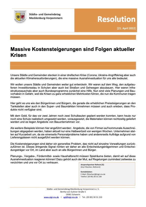 „Uns geht es wie den Bürgern, die gerade die erheblichen Preissteigerungen an den Tankstellen, aber auch in den Super- und Baumärkten hinnehmen müssen und auch erleben, dass Produkte nicht verfügbar sind. Die Kostensteigerungen sind daher ein generelles Problem, das nicht auf einzelne Verwaltungen zurückzuführen ist. Dieses dringende Signal richten wir daher an alle Entscheidungsträger vor Ort, im Land aber auch an alle Bürger“, führte Thomas Beyer, Vorstandsvorsitzender des Städte- und Gemeindetages M-V, aus.