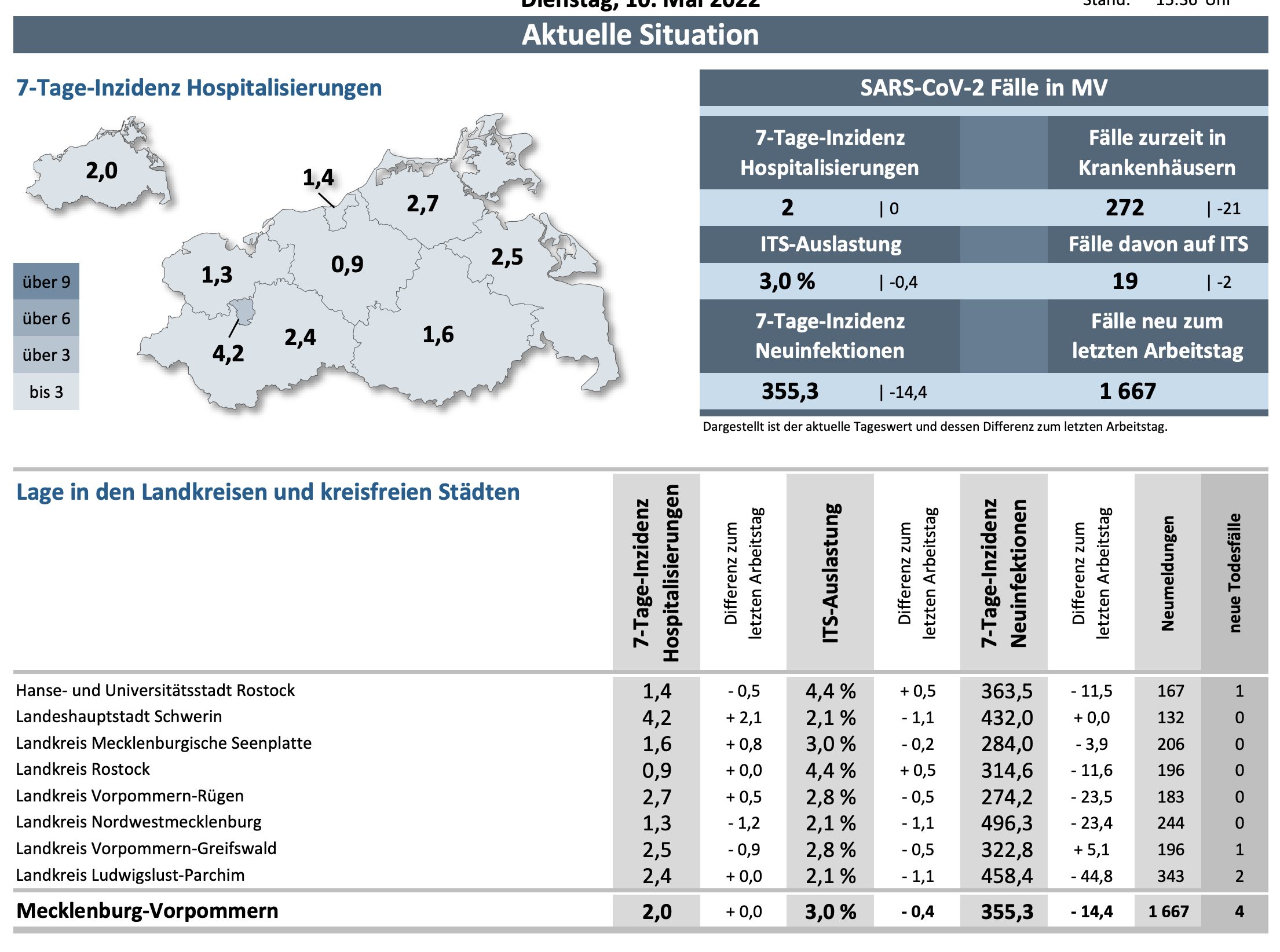 Die Hospitalisierung in ganz Mecklenburg-Vorpommern liegt heute bei 2,0, die Inzidenz des Landes bei 355,3. Das Land Mecklenburg-Vorpommern meldet heute 1667 Neuinfektionen und vier neue Todesfälle.