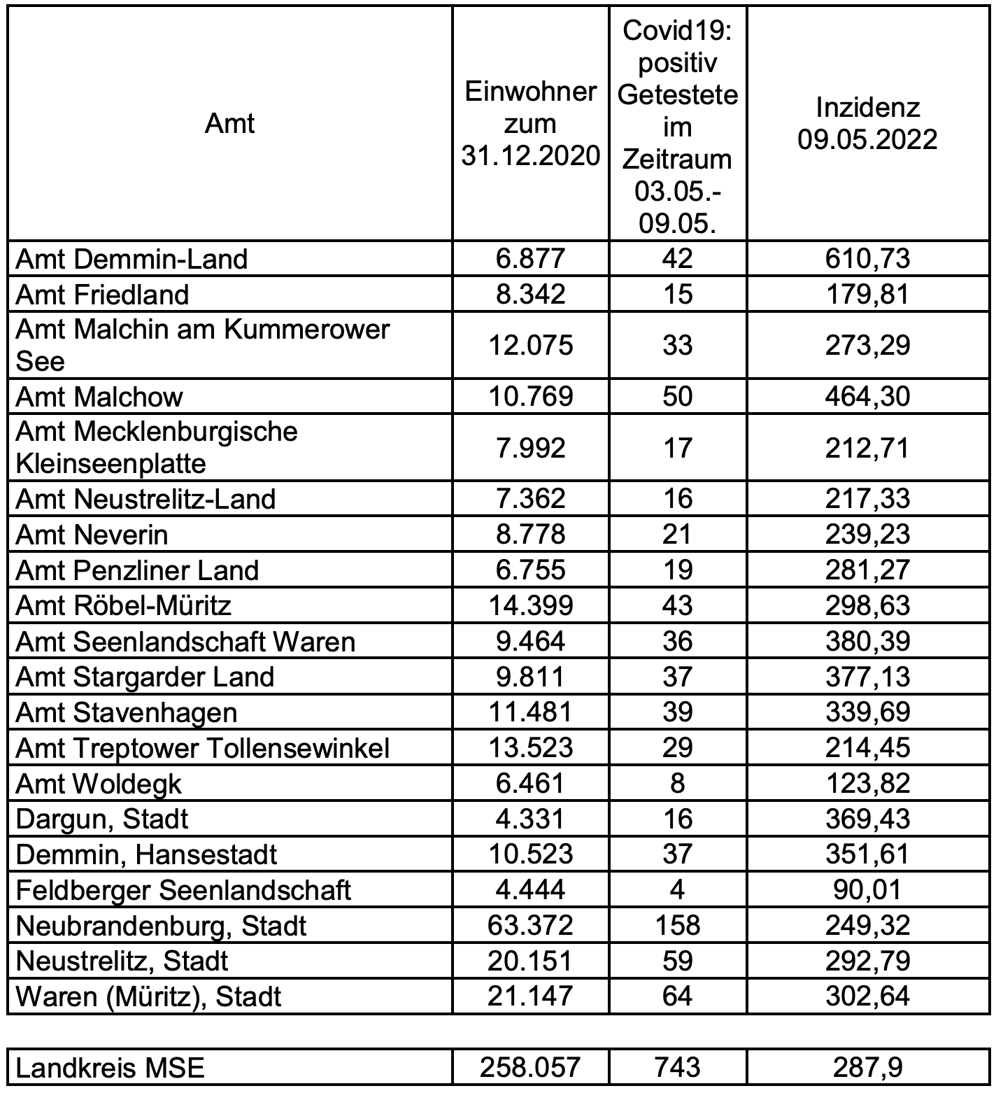 Die Inzidenz des Landkreises Mecklenburgische Seenplatte liegt heute bei 284. Für den Landkreis werden heute 206 Neuinfektionen gemeldet. Im heutigen Artikel veröffentlichen wir wieder die Inzidenzen des Landkreises für die einzelnen Städte und Ämter. Demnach liegt die Inzidenz im Amt Malchow bei 464,30, im Amt Penzliner Land bei 281,27, im Amt Röbel-Müritz bei 298,63, im Amt Seenlandschaft Waren bei 380,39 und in der Stadt Waren bei 302,64.