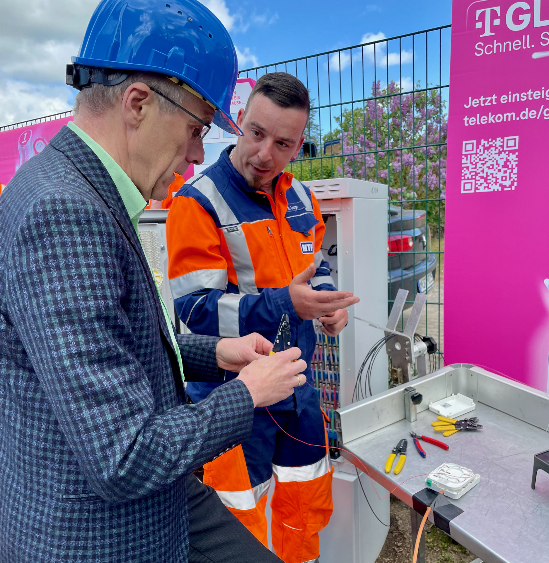 Die Verlegungsarbeiten erledigt das Unternehmen MTF aus Kriesow für die Telekom, Norbert Möller hat sich unter Anleitung von Mitarbeiter Andreas Lerge gestern am Schaltkasten am Volksbad in Waren auch mal selbst an den Glasfaser-Kabeln versucht, musste sich dann aber eingestehen, dass er diese Arbeit doch lieber den Fachleuten überlässt. Sein Kabel hat er beim Bearbeiten nämlich gekappt.
