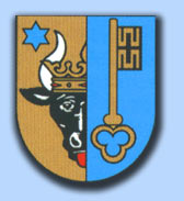 Gleichzeitig beschlossen die Politiker, wie das Wappen der Stadt auszusehen hat: „Das schildförmig gespaltene Wappen zeigt rechts auf goldenem Grund einen längsgeteilten, gekrönten schwarzen Stierkopf mit roter Zunge, silbernem Horn und goldener Krone. Im roten Schildwinkel neben dem Stierhorn befindet sich ein sechszackiger blauer Stern. Die linke Wappenseite zeigt einen aufgerichteten nach auswärts gekehrten goldenen Schlüssel auf blauen Grund.
