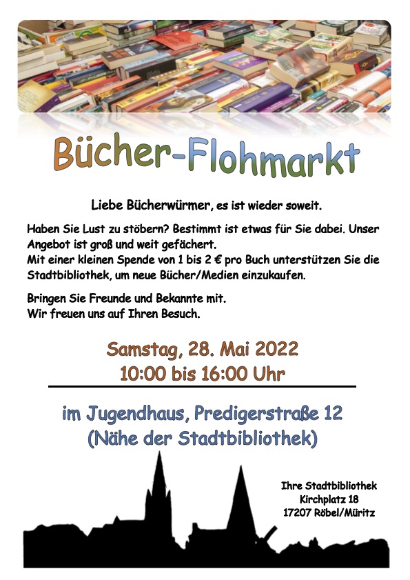 In Röbel darf am morgigen Sonnabend, 28. Mai, wieder gestöbert werden: Die Stadtbibliothek lädt von 10 bis 16 Uhr ins Jugendhaus zum großen Bücherflohmarkt ein. Mehr als 15.000 Medien, wie Bücher, DVDs und Schallplatten sind im Angebot. Mit einer kleinen Spende von 1-2 Euro pro Buch wird die Stadtbibliothek Röbel unterstützt, um neue Bücher/Medien einzukaufen.
