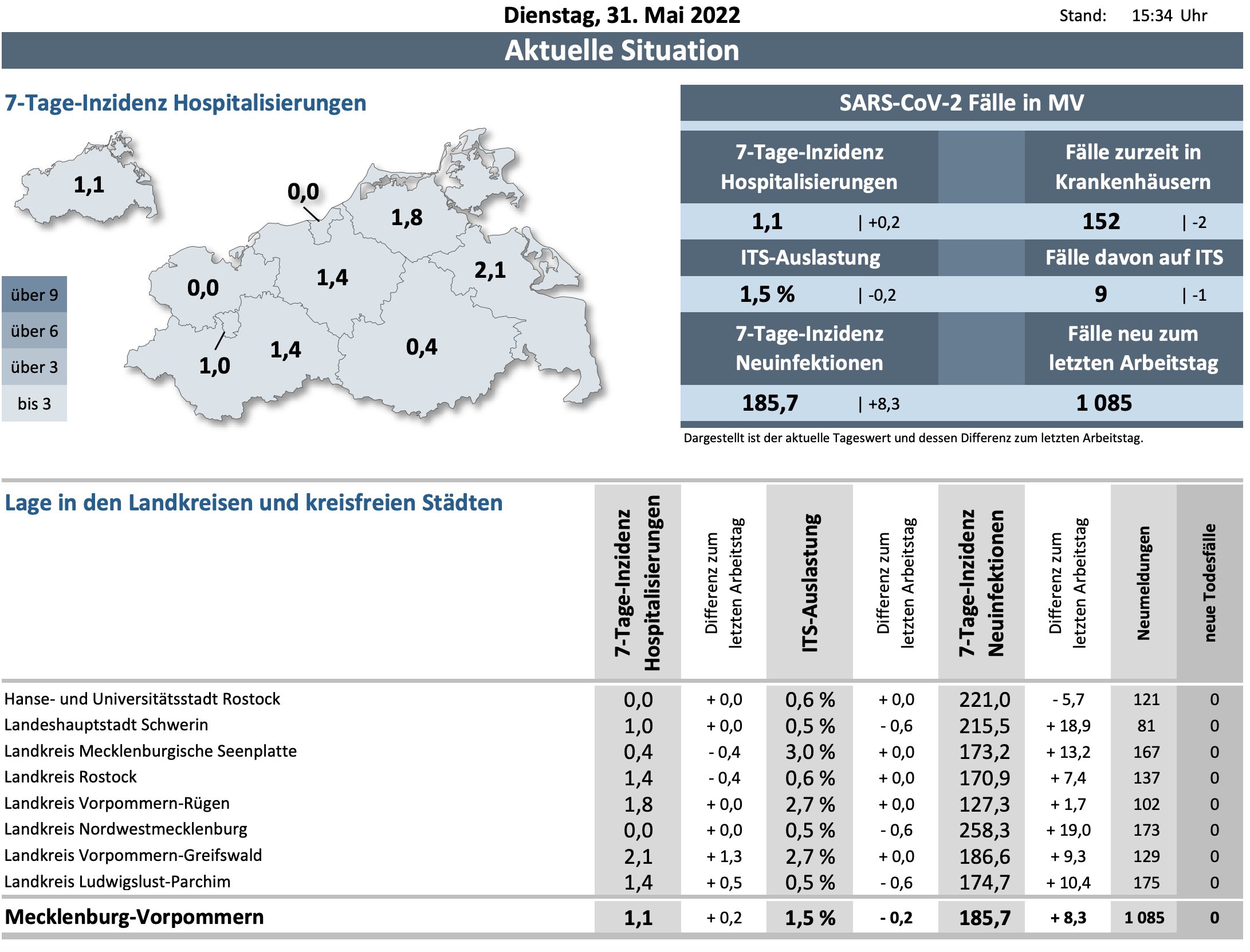 Die Hospitalisierung in ganz Mecklenburg-Vorpommern liegt heute bei 1,1, die Inzidenz des Landes bei 185,7. Das Land Mecklenburg-Vorpommern meldet heute 1085 Neuinfektionen und keinen neuen Todesfall.