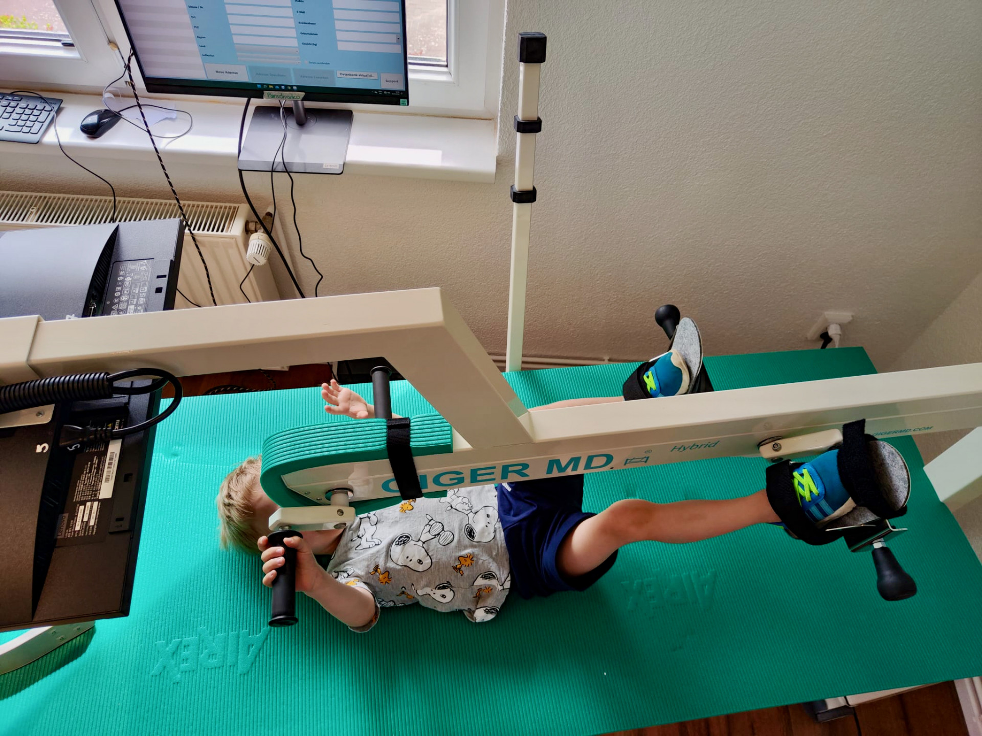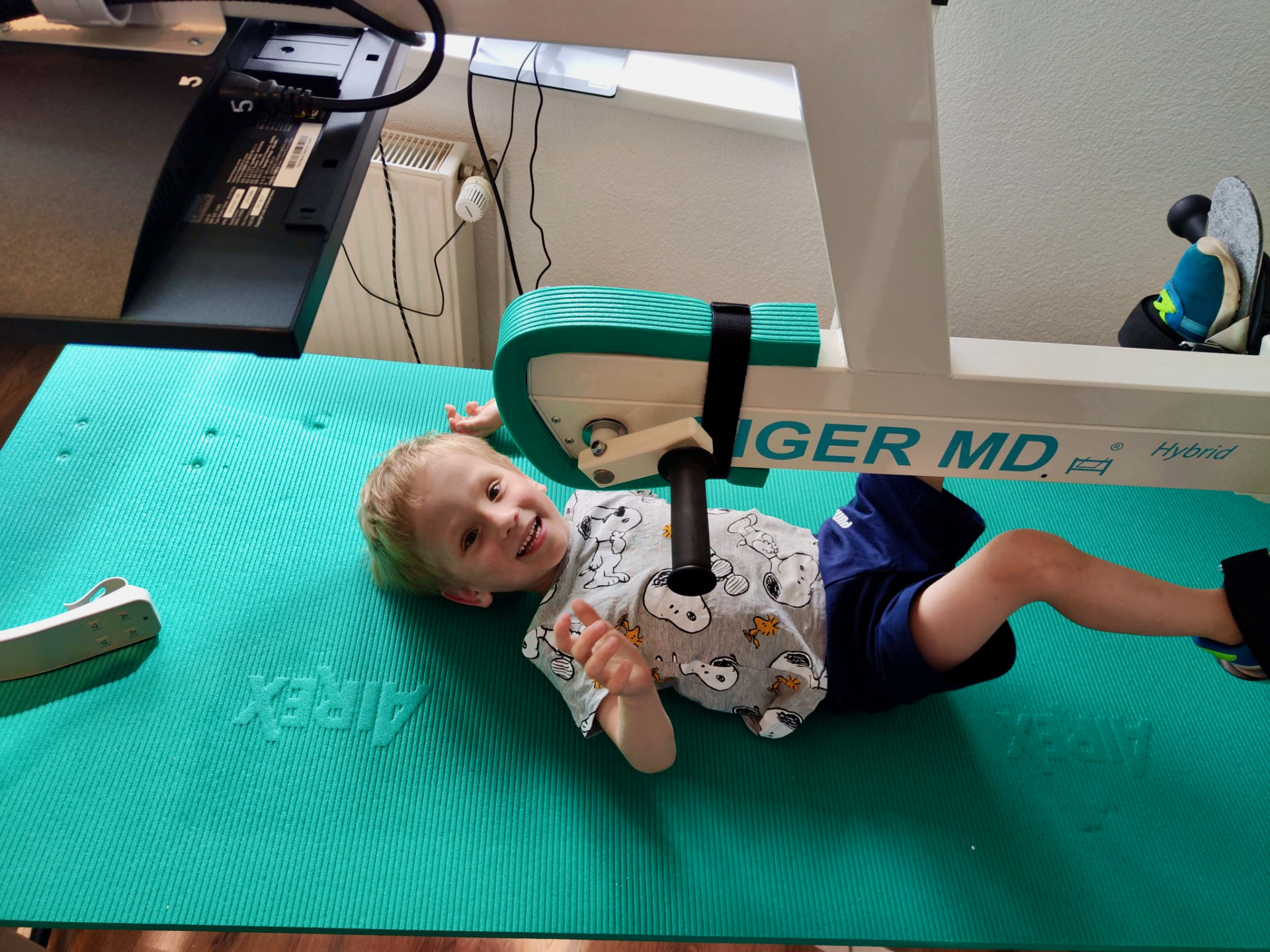 Dann erfuhr Familie Panschenko von einer besonderen Therapie in der Schweiz. Anfang Januar fuhren Mama und Papa für eine Woche mit Hugo dort hin. Und es zeigte sich, dass ihm die Behandlung gut tut. Allerdings muss sie fortgesetzt werden. Am besten täglich und mit einem speziellen Gerät, das sich Giger-MD nennt. Damit kann Hugo auch zu Hause trainieren. Das Gerät kostet mehr als 20 000 Euro. Und auch wenn Mama und Papa arbeiten – die 20 000 Euro hatten sie nicht mal eben auf der hohen Kante.