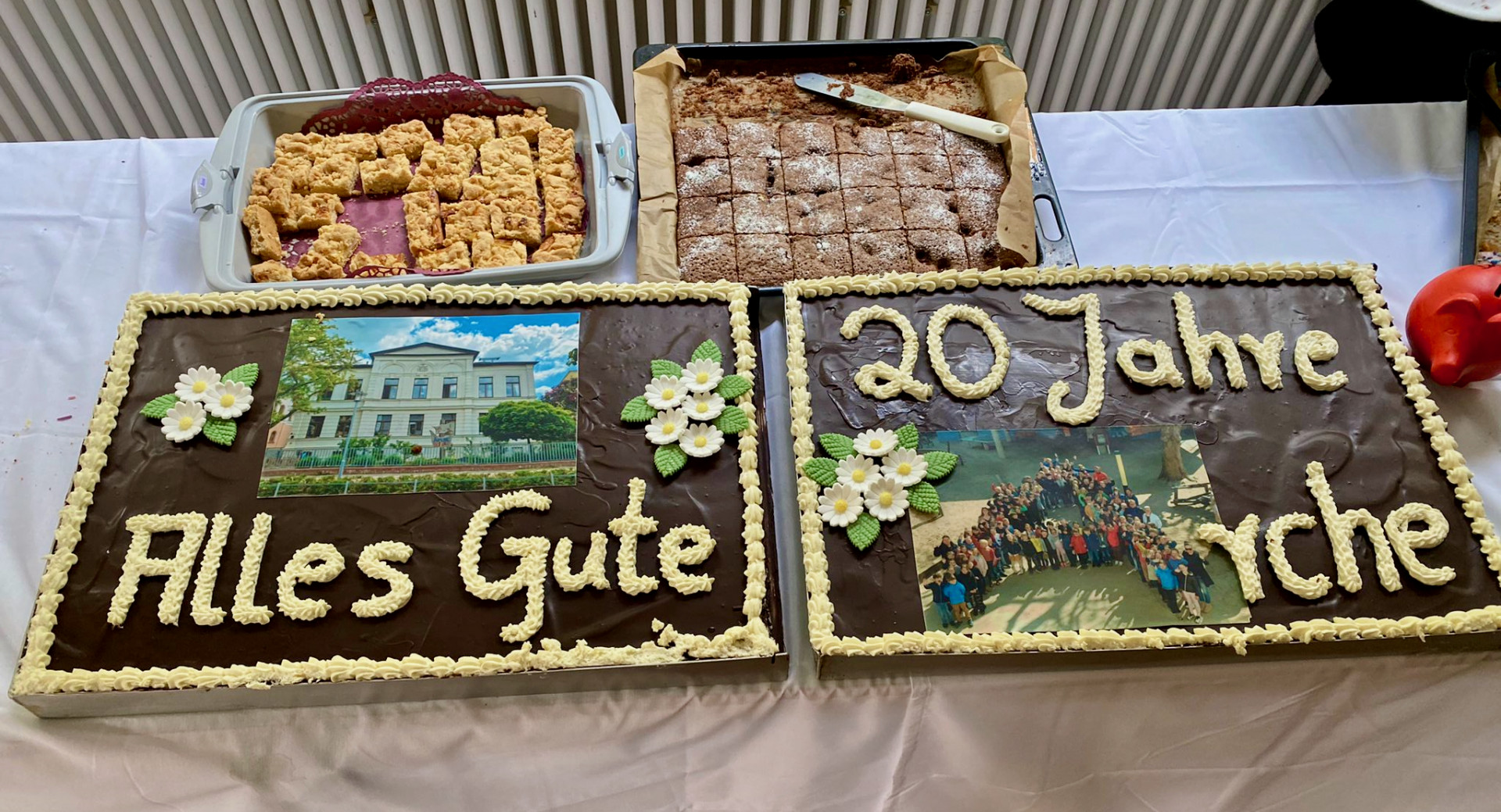 Ein besonderes Dankeschön der Schulleitung für eine gelungene Jubiläums-Woche geht an die Mecklenburger Backstuben, die 400 Brötchen spendiert hat, an Matthias Wolter vom Autohaus Multhaup, der eine Popcornmaschine vorbei brachte, an die Nähschwestern, die den Apfelbaum spendeten, an Marie Gardemann, die für eine Nashi-Birne sorgte, an Heiko Bünger, der eine tolle Jubiläumstorte zauberte, an Warens Bürgermeister Norbert Möller für den Papierhaus-Gutschein, an Frau Dr. Burggraf & Frau Dr. Herrlich für die Geldspende sowie für die vielen anderen liebevollen Geschenke zum 20. Schuljubiläum. Ein ganz besonderer Dank geht an alle Eltern, die hinter den Kulissen bei den Projekttagen und beim Schulfest mitwirkten.