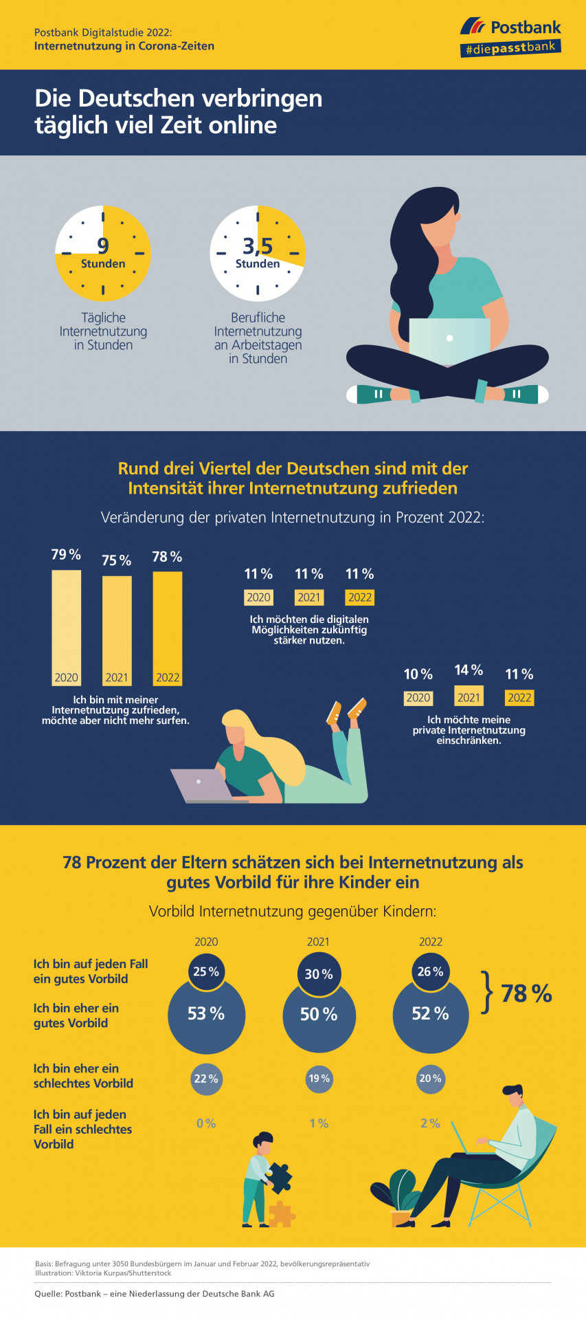 Die Deutschen sind durchschnittlich mehr als neun Stunden täglich online, davon nur etwa 3,5 Stunden beruflich. Ist das zu viel private Online-Zeit? Nein, sagen 78 Prozent: Sie sind zufrieden damit, wie intensiv sie das Internet nutzen. Nur elf Prozent wollen sich einschränken – im Jahr davor waren es mehr. Genauso viele wollen künftig sogar verstärkt im Web unterwegs sein. Dies sind Ergebnisse der repräsentativen Postbank Digitalstudie 2022.