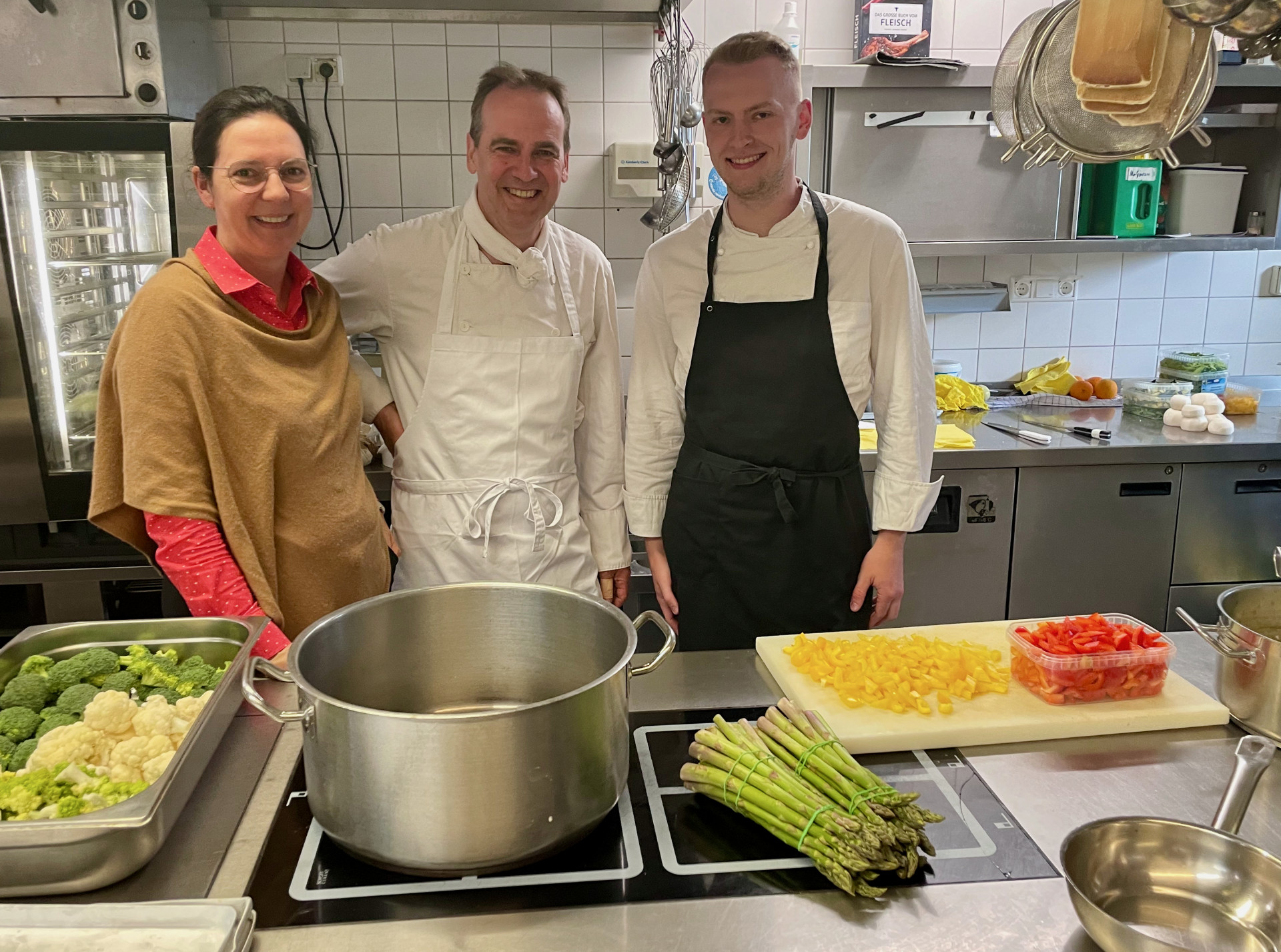 Foto oben: Tim Steinhöfel (rechts) liebt den Umgang mit frischen Lebensmittel: Chefkoch Hendrik Türk und Hotel-Chefin Kati Strasen freut’s.