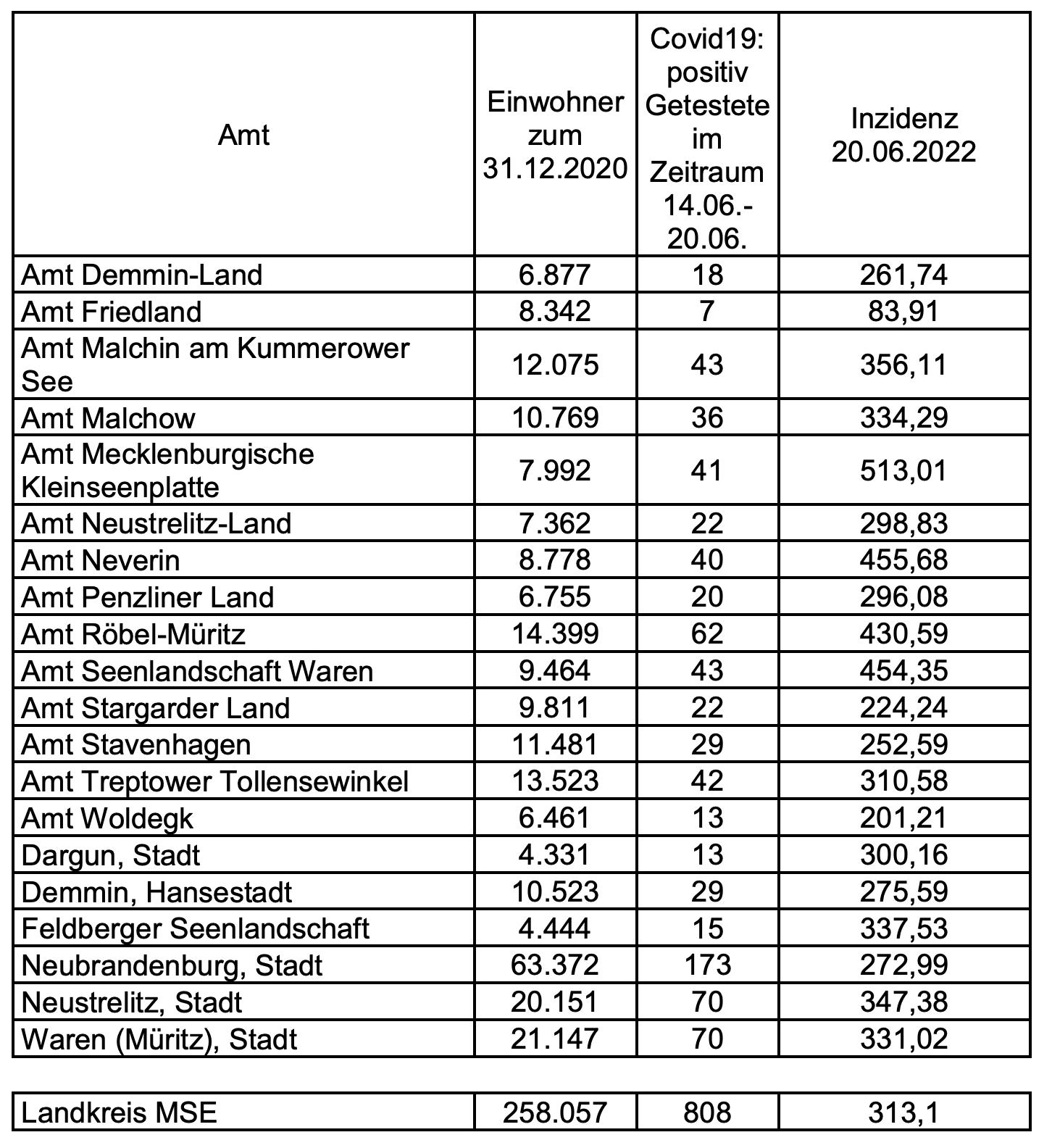 Heute wieder die aktuellen Corona-Inzidenzen des Landkreises Mecklenburgische Seenplatte – aufgeschlüsselt nach Städten und Ämtern. Demnach meldet das Amt Malchow eine Inzidenz von 334,29, das Amt Penzliner Land von 296,08, das Amt Röbel-Müritz von 430,59, das Amt Seenlandschaft Waren von 454,35 und die Stadt Waren von 331,02.