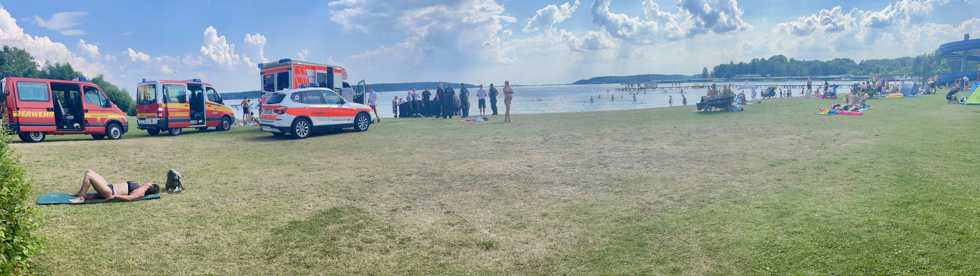 Bevor jetzt entsprechende Bemerkungen kommen – Ja, wir waren vor Ort. Beruflich. Wir haben uns zurückgehalten, konnten das, was um die vielen Einsatzfahrzeuge herum passierte, aber gar nicht fassen. Da versuchen erwachsene Menschen, denen man eigentlich mehr Grips zutrauen sollte, vom Wasser aus doch noch einen Blick auf die unermüdlich um das Leben der Frau ringenden Helfer zu werfen. Sie nähern sich schwimmend oder sogar auf dem Standup-Board. Da setzt man sich in die Hocke, um Fotos oder Videos unter den Tüchern hindurch mit dem Handy zu machen. Und immer wieder Grüppchen, die sich Schritt für Schritt „anschleichen“.