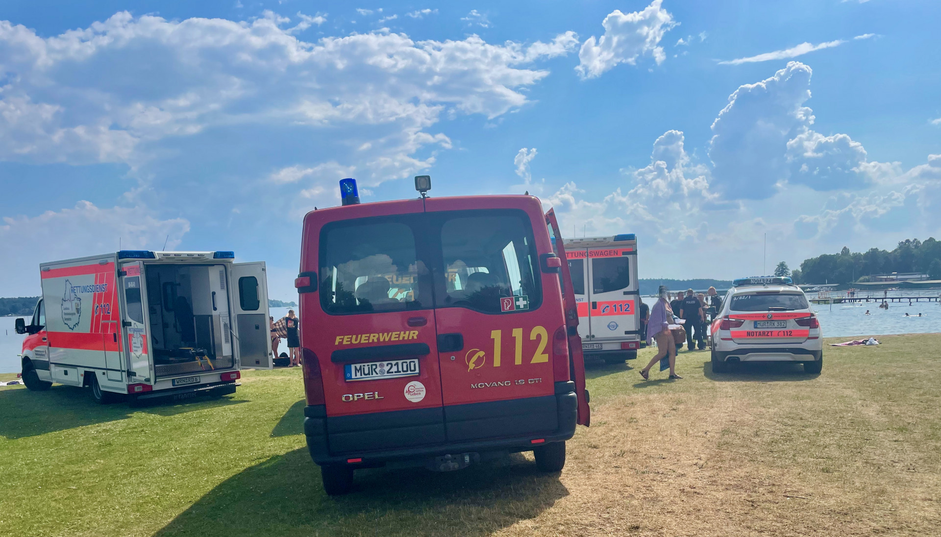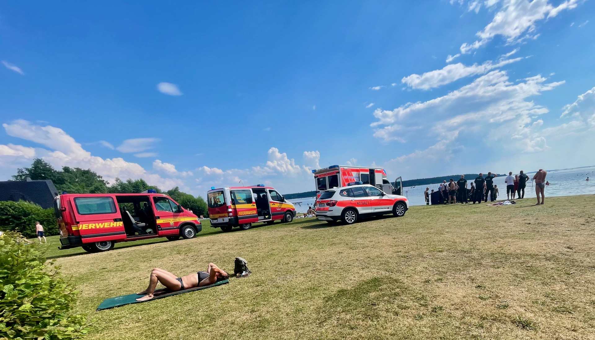 Ein unbeschwerter Sommertag endet in einer Tragödie: Am Warener Volksbad haben sich heute Nachmittag dramatische Szenen abgespielt. Badegäste entdeckten plötzlich eine Frau leblos mit dem Gesicht im Wasser treibend. Die anwesende Rettungsschwimmerin war sofort zur Stelle, zog die Frau ans Ufer und begann mit der Reanimation. Notarzt und Notfallsanitäter übernahmen wenig später. Doch für die 67-Jährige kam leider jede Hilfe zu spät. Und während ganz viele Helfer – DRK, Notarzt, Wasserwacht, Rettungsschwimmer und Feuerwehr – fast zwei Stunden lang mit vereinten Kräften um das Leben der Frau kämpften, ging der Badetrubel ringsherum fröhlich weiter. Teilweise sehr dicht am Ort des Geschehens. Zwar haben zunächst andere Badegäste die Rettungsaktion mit ihren Handtüchern abgeschirmt, doch immer wieder versuchten Schaulustige dichter an das Geschehen heran zu kommen – teilweise vom Wasser aus. Letztendlich rückte Warens Feuerwehr mit Sichtschutz an. Aber auch das störte einige nicht.