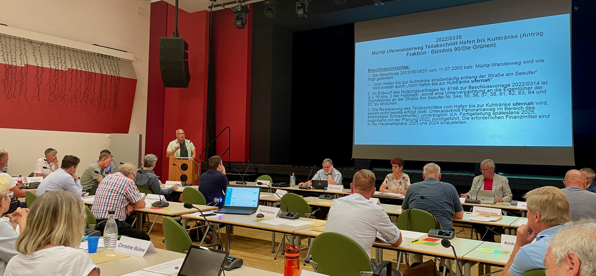 Für die FDP/MUG-Fraktion legte sich Toralf Schnur gut vorbereitet ins Zeug. „Wir verwahren uns dagegen, dass Sie uns unterstellen, nicht für das Gemeinwohl zu entscheiden. Ihr katastrophales Ansinnen ist nicht für die Allgemeinheit zum Vorteil“, startete der Liberale seinen Feldzug. Auf 50 Prozent des nun geplanten Uferwanderweges gebe es gar keinen Blick auf die Müritz. „Eine Fraktion, die noch vor kurzem Schottergärten in Waren verbieten lassen wollte, möchte jetzt einen Uferstreifen auf insgesamt 500 Quadratmetern versiegeln“, so Schnur. Es gebe zwar die Zahl, dass täglich um die 1500 Fahrräder in beide Richtungen am Seeufer entlang fahren, Unfallzahlen allerdings fehlen. „Alles nur Hörensagen, kein Beleg dafür, dass es dort öfter kracht.“