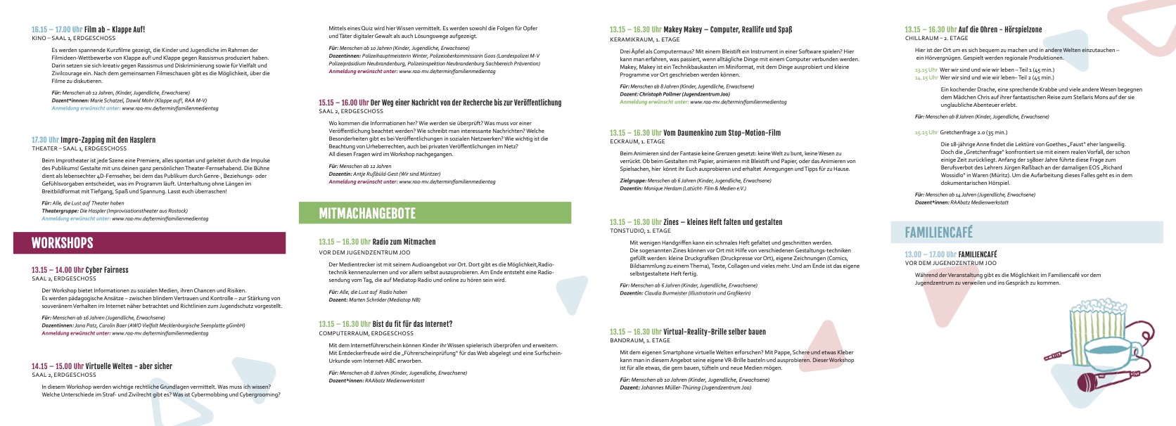 Der „Familien.Medien Tag“ ist eine Veranstaltung der RAAbatz Medienwerkstatt (RAA MV), des Förderverein der Regionalen Schule Waren/West e.V., des Jugendzentrum JOO und der Stadt Waren (Müritz). Gefördert wird er durch die Partnerschaft für Demokratie Waren (Müritz) im Rahmen des Bundesprogramms „Demokratie leben!“.