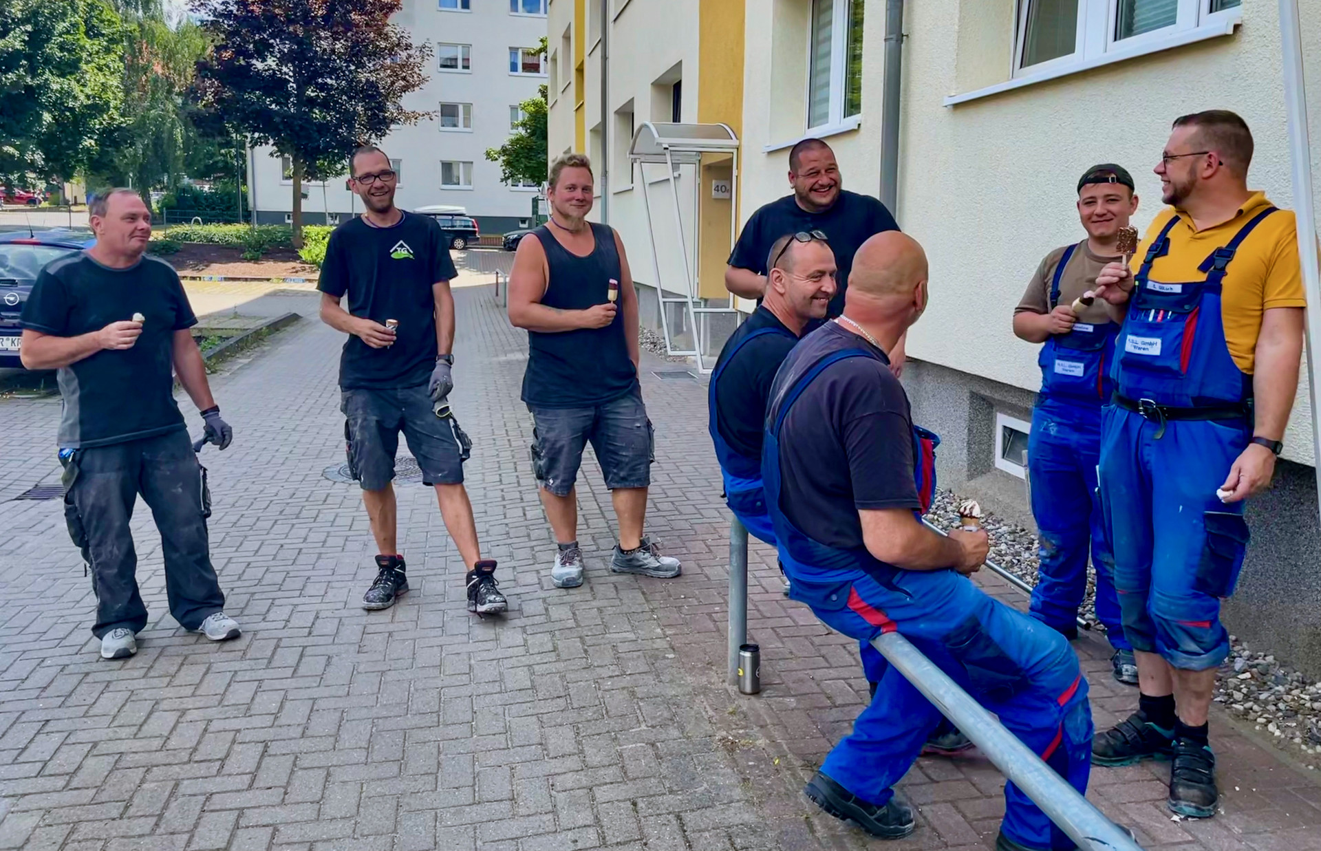 Gestern begann die Strangsanierung in der Hausnummer 40 c. Da kam die Eislieferung kurz nach der Mittagspause ganz recht. Die Bauleiterin Heidrun Affeldt und die Handwerker der Firmen HSL GmbH Waren, der Hausmeisterfirma Tom Günther sowie die Fliesenleger der Firma Ulf Werner nutzten die gemeinsame Zeit für einen Plausch, bevor es weiter an die Arbeit ging.