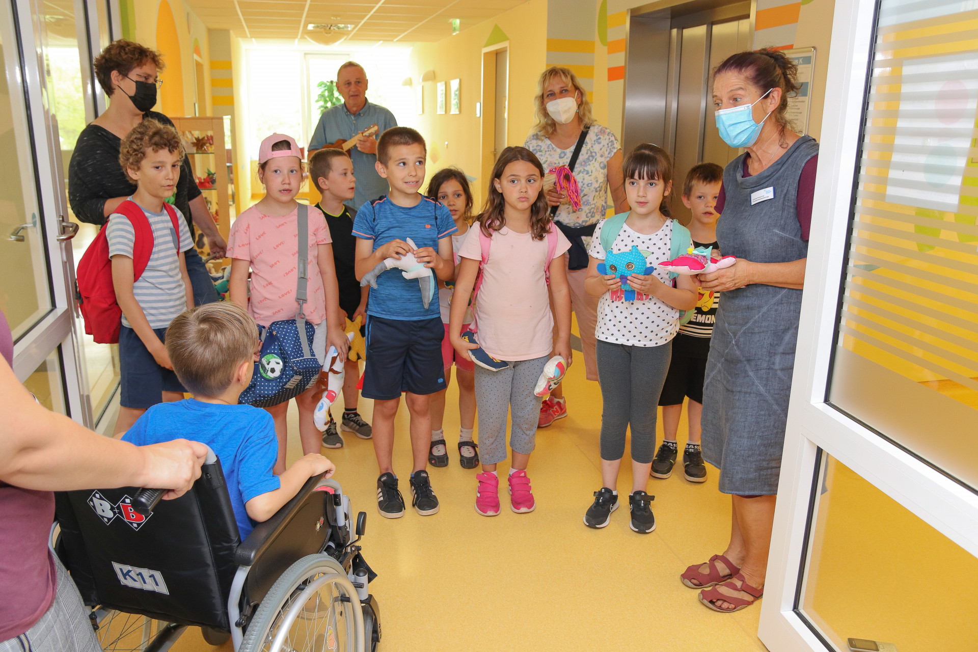 Foto: Während der Übergabe der Plüschtiere durften die Hortkinder von außen einen Blick auf die Kinderstation K11 werfen. Seelsorgerin Andrea Rosenow (rechts) verteilte einen großen Teil der Geschenke gleich auf den Stationen im Kinderhaus. (Foto: DBK)