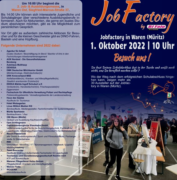 Nach der gelungenen Premiere vor einem Jahr geht die “Job-Factory” auf dem Gelände der Warener Firma Eggersmann am kommenden Sonnabend, 1. Oktober, in die zweite Runde. Stand an Stand, zahllose Informationsflyer und freundliche, den Besuchern zugewandte Gesichter – das alles und viel mehr erwartet Schüler, Eltern und sonstige Interessenten von 10 bis 14 Uhr. Lokale und regionale Unternehmen sind auf dem Gelände der Firma Eggersmann in der Siegfried-Marcus-Straße 37 dabei. Von klassischer Ausbildung, über (duales) Studium bis hin zu Freiwilligendiensten – das angebotene Spektrum reicht weit. Dabei spielt es auch keine Rolle, welche Art von Schulabschluss angestrebt wird, da verschiedene Ausbildungsberufe mit ebenso unterschiedlichen Voraussetzungen präsentiert werden. Auch Menschen, die sich vielleicht beruflich verändern wollen, bekommen bei der „Job-Factary“ viele Infos.