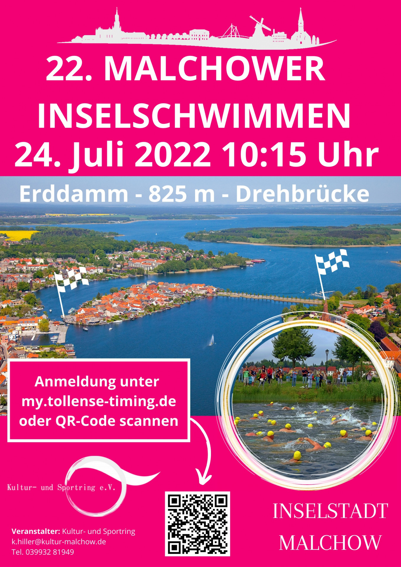 Auch in diesem Jahr darf das traditionelle Inselschwimmen in Malchow nicht fehlen. Am 24. Juli um 10:15 Uhr fällt der Startschuss für das nun schon 22. Inselschwimmen inzwischen in die 22. Runde. Auf einer Strecke von 825 Metern schwimmen die Teilnehmer vom Erddamm (Klosterklause) bis zur Drehbrücke (Insulaner). Anmeldungen sind unter my.tollense-timing.de oder am selben Tag vor Ort ab 9 Uhr möglich. Die Startgebühr beträgt 10 Euro (7,00 € für Jahrgang 2007 – 2009).