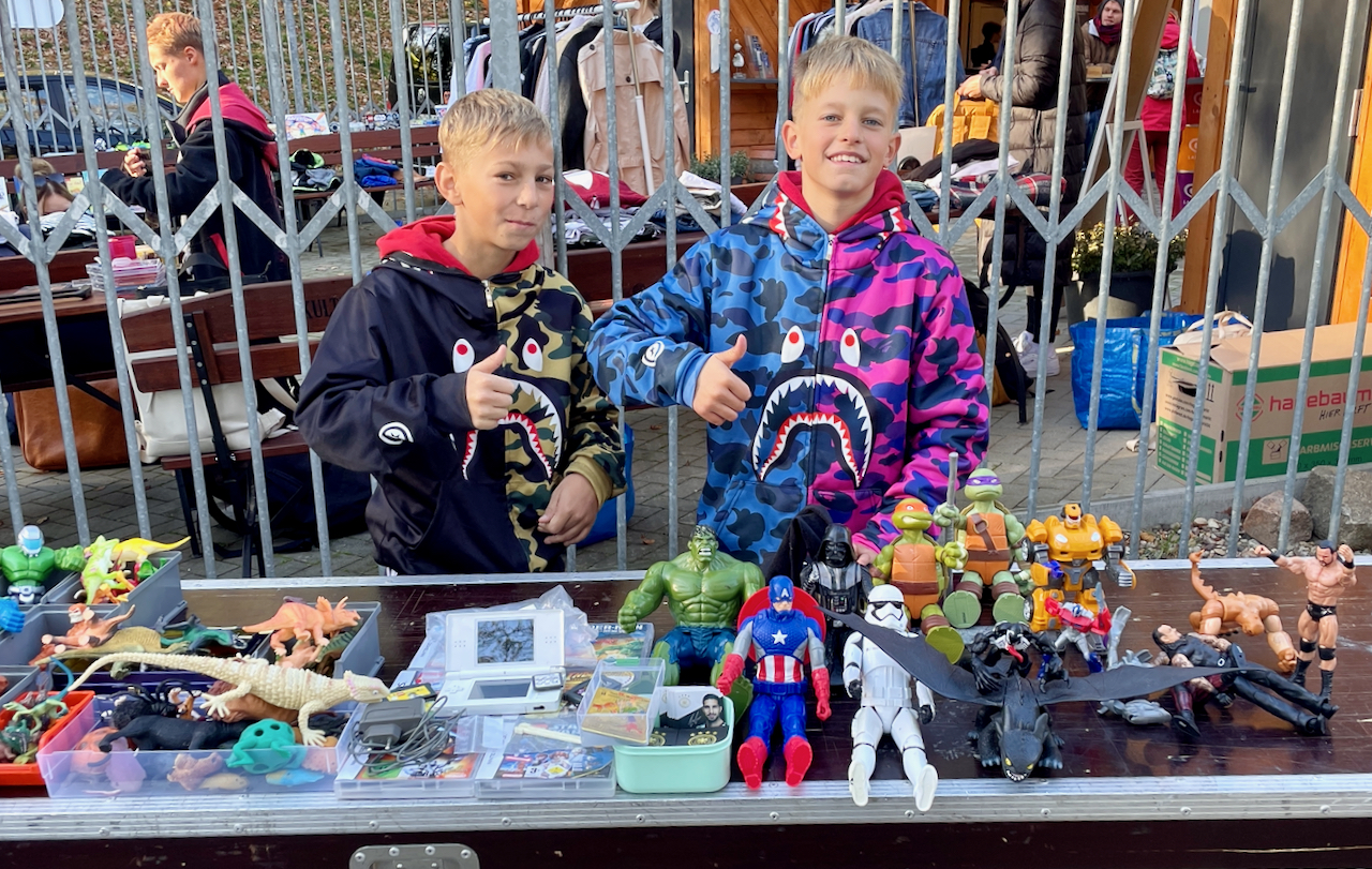 Zu den Verkäufern zählten auch der zehnjährige Till und sein zwölfjähriger Kumpel John. Beide boten vor allem Spielsachen an. Beim Aufbauen ihres Standes guckten sie sich die ausrangierten Dinge aber noch einmal ganz genau an: „Soll das wirklich weg oder behalten wir es doch“, war die Frage aller Fragen. Letztendlich hatten die beiden Jungs richtig viel Spaß. Lief ja auch wirklich gut an ihrem Stand, und Mama und Papa hatten zuvor gesagt, dass sie den Verkaufserlös behalten können…